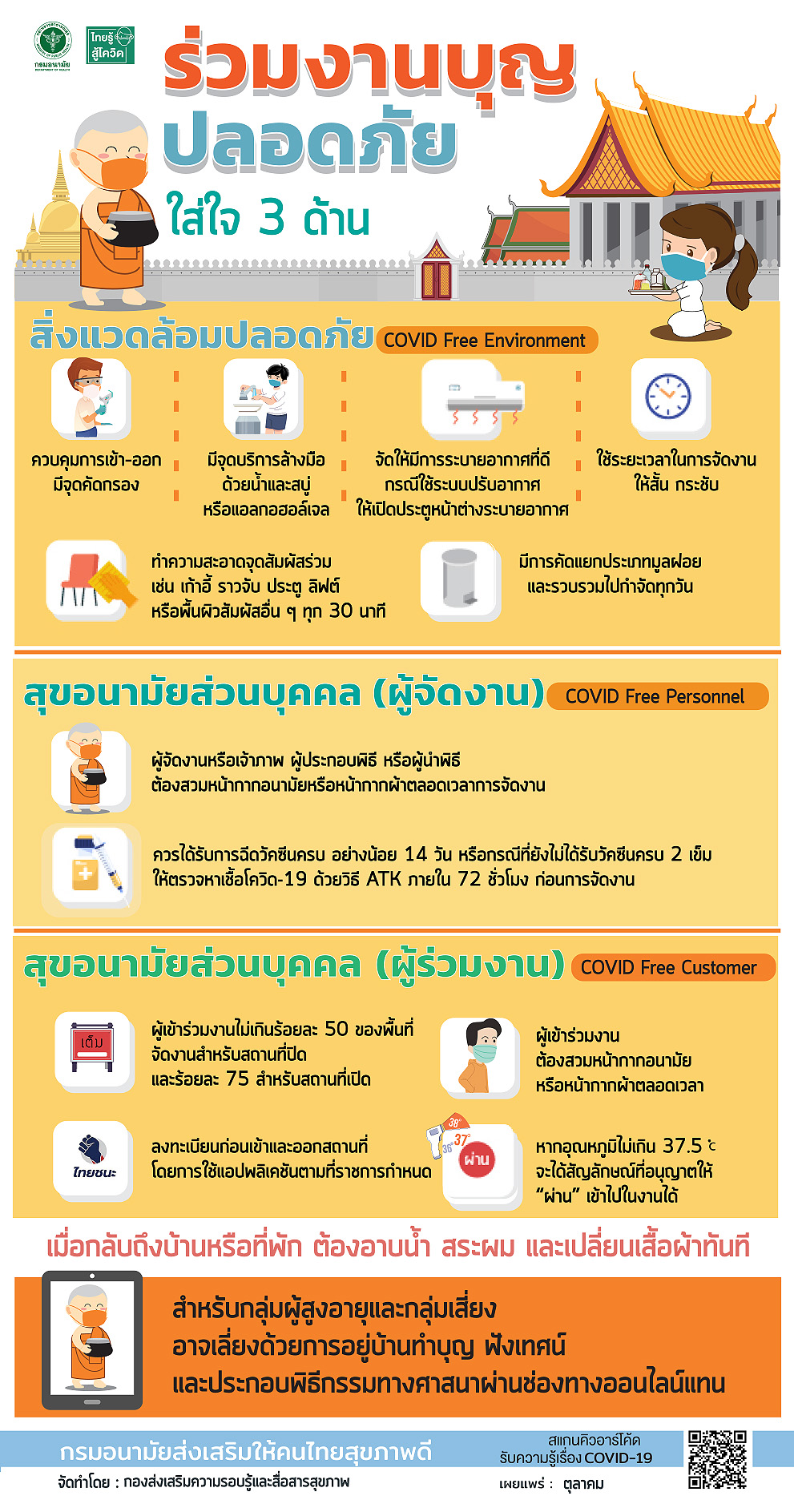 สำหรับวัดและกลุ่มประชาชนทั่วไปยังขอความร่วมมือปฏิบัติตามมาตรการ COVID Free Setting อย่างเคร่องครัดทั้ง 3 ด้าน คือ ด้านที่ 1 COVID Free Environment สิ่งแวดล้อมปลอดภัย ควบคุมการเข้า–ออก มีจุดคัดกรอง และจุดบริการล้างมือด้วยน้ำและสบู่หรือแอลกอฮอล์เจล พร้อมจัดให้มีหน้ากากผ้าหรือหน้ากากอนามัย ใช้ระยะเวลาในการจัดงานให้สั้นที่สุด