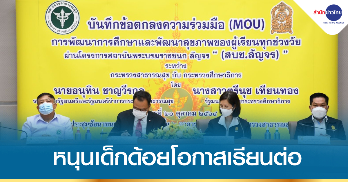 นายอนุทิน ชาญวีรกูล รองนายกรัฐมนตรีและรัฐมนตรีว่าการกระทรวงสาธารณสุข (สธ.) พร้อมด้วย น.ส.ตรีนุช เทียนทอง รัฐมนตรีว่าการกระทรวงศึกษาธิการ (ศธ.) ลงนามความร่วมมือให้โอกาสเข้าถึงการศึกษาด้านวิทยาศาสาตร์สุขภาพ ผ่านโครงการ สบช.สัญจร โดยจะสนับสนุนทุนการศึกษาและมอบโควตาทางการศึกษาแก่นักเรียน 7,000 คน คัดเลือกจากนักเรียนที่ขาดแคลนทุนทรัพย์ ในท้องถิ่นห่างไกลทุรกันดาร โดยเป็นนักเรียนในระดับมัธยมศึกษาตอนปลายที่มีเจตคติที่ดีต่อวิชาชีพด้านสุขภาพ หรือมีความสามารถด้านศิลปะ ซึ่งจะเริ่มสัญจรใน 4 จังหวัด ได้แก่ ชัยภูมิ นครราชสีมา บุรีรัมย์ สุรินทร์ ในวันที่ 29 ต.ค.64 และ 23-24 พ.ย.64 ใน 6 จังหวัด ได้แก่ ระยอง จันทบุรี ตราด สระแก้ว ชลบุรี สมุทรปราการ และฉะเชิงเทรา