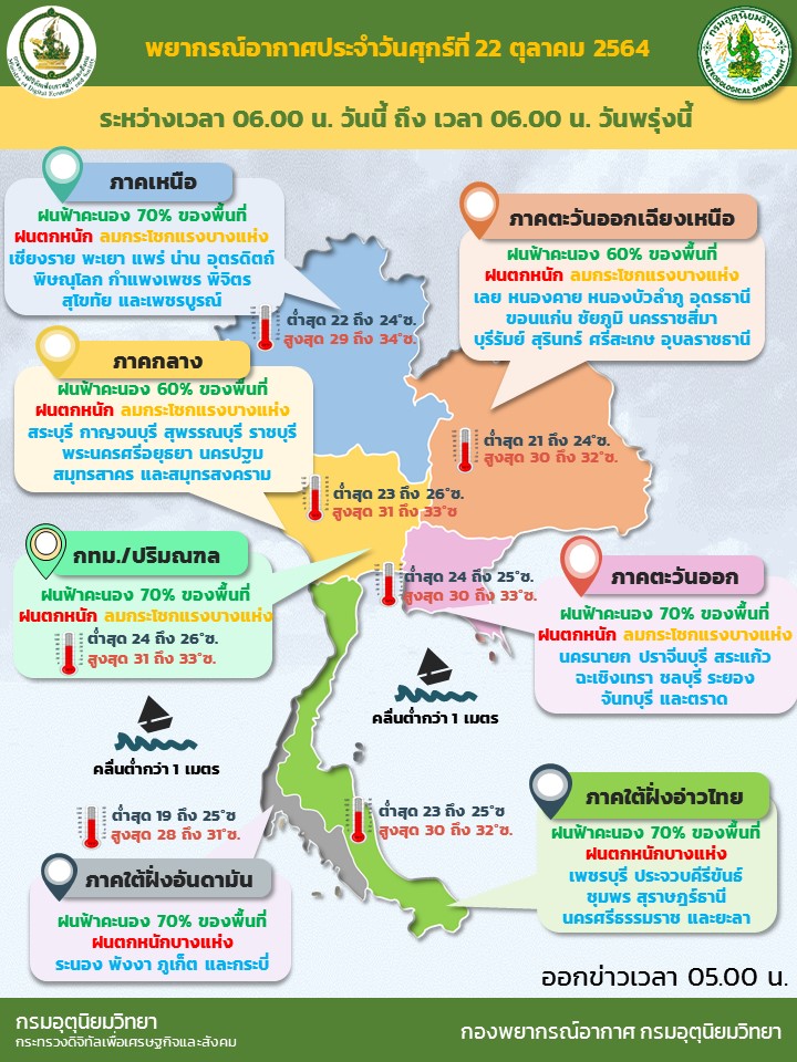 กรมอุตุนิยมวิทยา พยากรณ์อากาศ 24 ชั่วโมงข้างหน้า บริเวณความกดอากาศสูงระลอกใหม่อีกระลอกหนึ่งจากประเทศจีนได้แผ่ลงมาปกคลุมบริเวณประเทศลาวตอนบนและทะเลจีนใต้ตอนบนแล้ว คาดว่าจะแผ่ลงมาปกคลุมบริเวณภาคเหนือตอนบนและภาคตะวันออกเฉียงเหนือตอนบนในวันนี้ (22 ตุลาคม 2564) ประกอบกับลมตะวันออกและลมตะวันออกเฉียงใต้ยังคงพัดปกคลุมบริเวณประเทศไทยตอนบน ในขณะที่มรสุมตะวันตกเฉียงใต้พัดปกคลุมทะเลอันดามัน ภาคใต้ และอ่าวไทย ลักษณะเช่นนี้ทำให้ประเทศไทยมีฝนเพิ่มขึ้น โดยมีฝนฟ้าคะนองกับมีลมกระโชกแรงเกิดขึ้นได้บางพื้นที่ในระยะแรก และมีฝนตกหนักบางแห่งในภาคเหนือ ภาคตะวันออกเฉียงเหนือ ภาคกลาง ภาคตะวันออก และภาคใต้ ขอให้ประชาชนในบริเวณพื้นที่เสี่ยงภัยดังกล่าวระวังอันตรายจากฝนฟ้าคะนองและลมกระโชกแรงที่อาจจะเกิดขึ้น รวมถึงระวังอันตรายจากฝนตกหนักและฝนที่ตกสะสม ซึ่งอาจทำให้เกิดน้ำท่วมฉับพลันและน้ำป่าไหลหลากในระยะนี้ไว้ด้วย