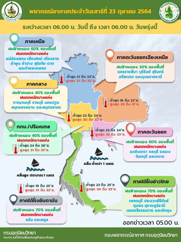 สำนักข่าวไทย 23 ต.ค.- กรมอุตุนิยมวิทยาเผยประเทศไทยตอนบนมีฝนลดลง แต่ยังมีฝนฟ้าคะนองและตกหนักบางแห่งในภาคเหนือ ภาคกลางตอนล่าง ภาคตะวันออก และภาคใต้