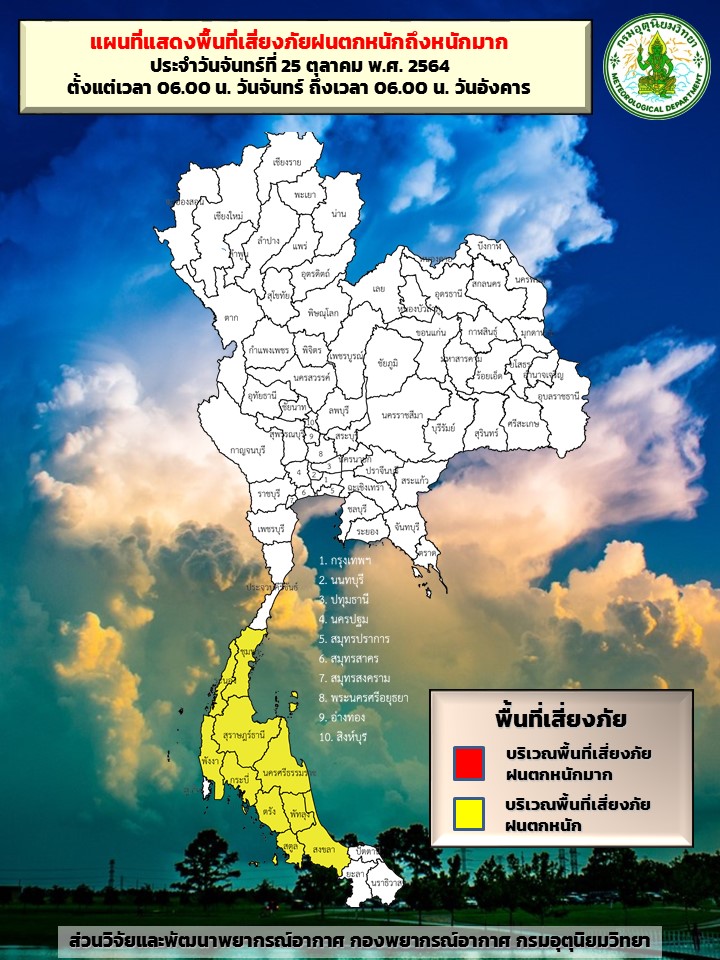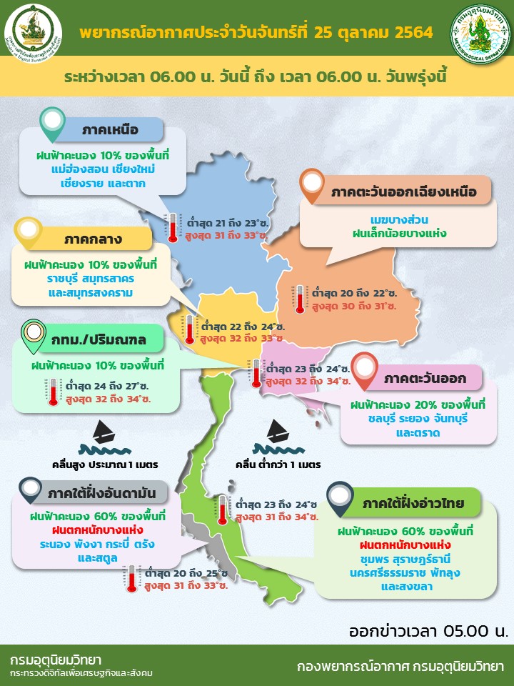 กรมอุตุฯ 25 ต.ค. – กรมอุตุฯ เตือนภาคใต้ฝนฟ้าคะนอง และมีฝนตกหนักบางแห่ง ส่วนกรุงเทพฯ และปริมณฑล ฝนฟ้าคะนอง 10% ของพื้นที่