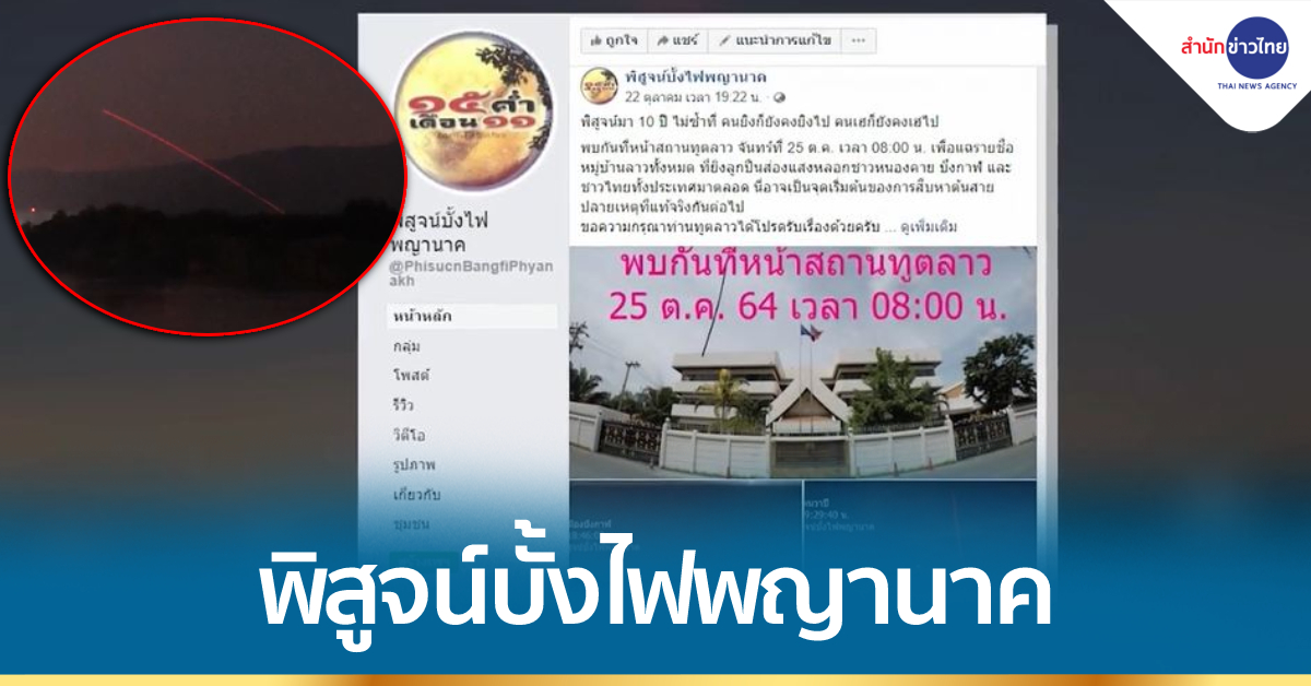 25 ต.ค. – เพจพิสูจน์บั้งไฟพญานาค เปิดภาพถ่ายและรายชื่อหมู่บ้านริมโขง ยิงกระสุนส่องแสงสร้าง “บั้งไฟพญานาค” พร้อมยื่นให้สถานทูตลาวตรวจสอบ ขณะที่นักวิชาการระบุแม้จะมีข้อถกเถียงเรื่องความเชื่อ แต่ควรเปิดกว้างเพื่อพิสูจน์ให้เกิดความเข้าใจที่ถูกต้องตามหลักวิทยาศาสตร์.-สำนักข่าวไทย
