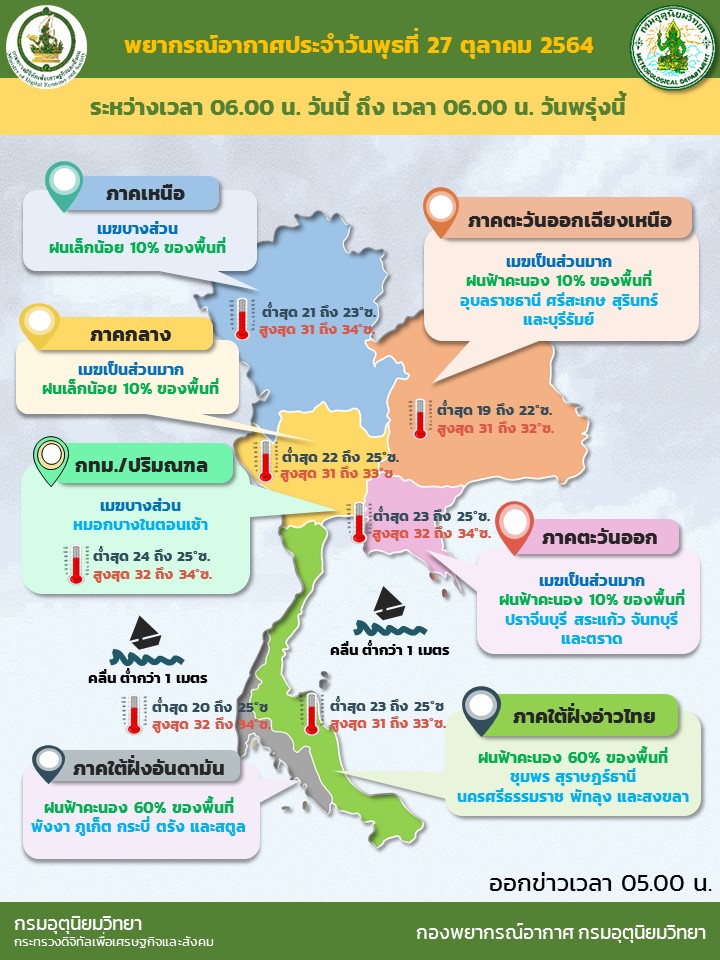 อนึ่ง เมื่อเวลา 04.00 น. หย่อมความกดอากาศต่ำกำลังแรงบริเวณทะเลจีนใต้ตอนกลาง ได้เคลื่อนขึ้นฝั่งประเทศเวียดนามตอนล่างแล้ว คาดว่าจะเข้าปกคลุมประเทศกัมพูชา ในวันนี้ (27 ตุลาคม 2564) โดยมีแนวโน้มอ่อนกำลังลง ลักษณะเช่นนี้ส่งผลให้ในช่วงวันที่ 27-29 ตุลาคม 2564 ประเทศไทยตอนบนมีฝนเพิ่มมากขึ้น ส่วนพายุโซนร้อน “หมาเหล่า” ที่ปกคลุมมหาสมุทรแปซิฟิก ไม่มีผลกระทบต่อลักษณะอากาศของประเทศไทย