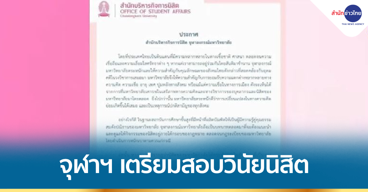 โดยมหาวิทยาลัยยืนยันว่าการดำเนินการตามแนวทางดังกล่าวไม่มีวัตถุประสงค์เพื่อลิดรอน หรือจำกัดเสรีภาพทางความคิด เสรีภาพทางวิชาการ หรือทางอื่นใด หากแต่เป็นไปเพื่อให้นิสิตของมหาวิทยาลัยเป็นผู้มีความรู้คู่คุณธรรมพร้อมทุกด้าน.-สำนักข่าวไทย
