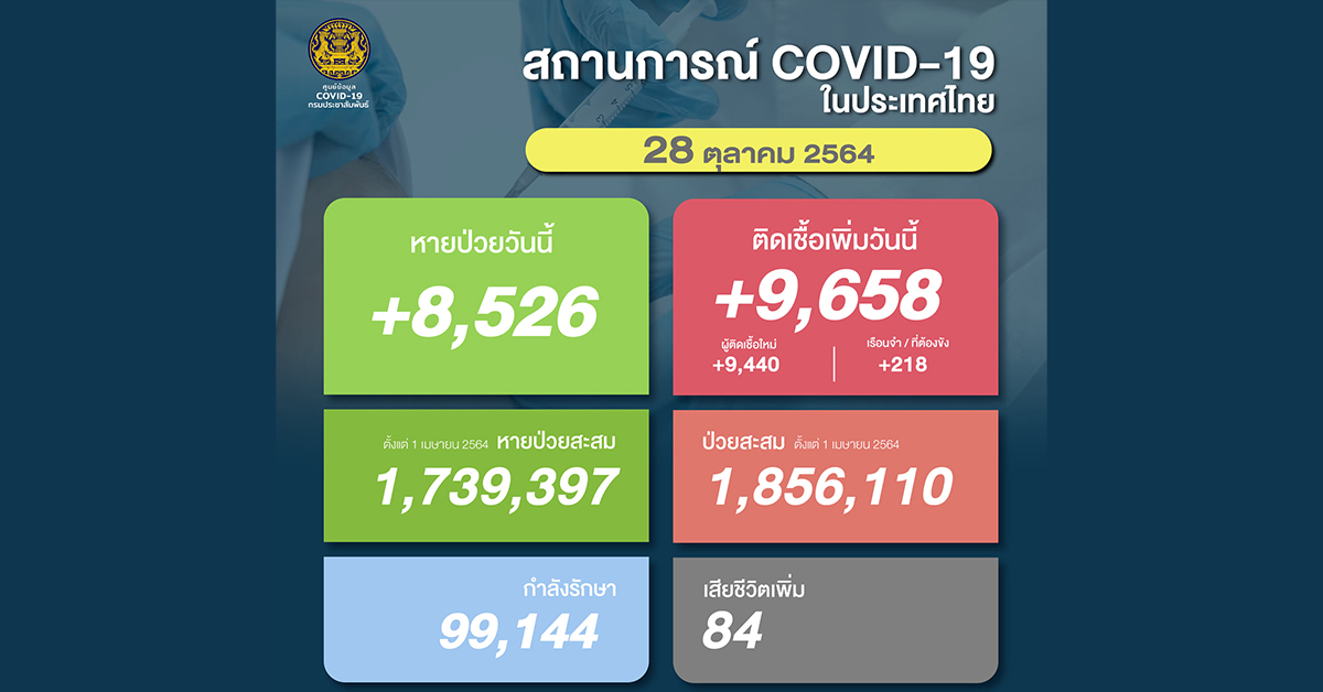 กรุงเทพฯ 28 ต.ค.-โควิดวันนี้ ติดเชื้อรวม 9,658 ราย หายป่วยกลับบ้าน 8,526 ราย เสียชีวิต 84 ราย ยอดป่วยสะสม 1,856,110 ราย (ตั้งแต่ 1 เมษายน)