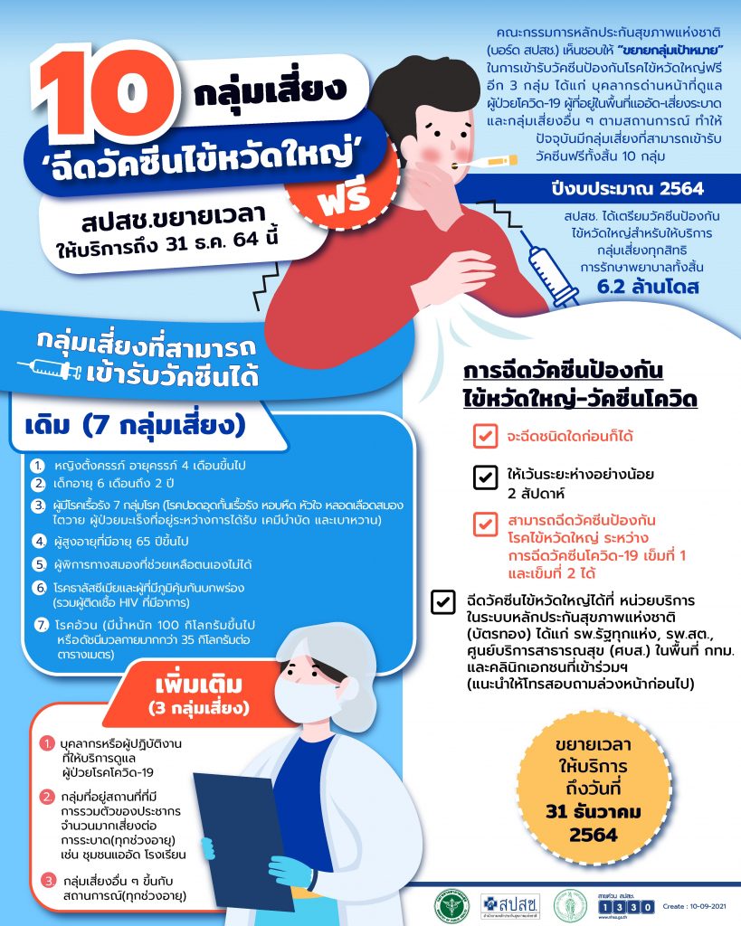 สำหรับประชาชน 7 กลุ่มเสี่ยง ได้แก่ 1.ผู้ป่วยโรคเรื้อรัง 7 โรค ( โรคปอดอุดกั้นเรื้อรัง หอบหืด หัวใจ หลอดเลือดสมอง ไตวาย ผู้ป่วยมะเร็งได้รับยาเคมีบำบัด เบาหวาน) 2. ผู้ที่มีอายุ 65 ปี ขึ้นไป 3. เด็กอายุ 6 เดือนถึง 12 ปี 4. ผู้พิการทางสมองที่ช่วยเหลือตัวเองไม่ได้ 5. ผู้ป่วยโรคธาลัสซีเมีย และผู้ที่มีภูมิคุ้มกันบกพร่อง (SLE) รวมถึงผู้ติดเชื้อ HIV ที่มีอาการ 6. หญิงตั้งครรภ์ อายุครรภ์ 4 เดือนขึ้นไป (รพ.ให้บริการตลอดทั้งปี) 7. ผู้ที่มีน้ำหนักตั้งแต่ 100 กิโลกรัม หรือ ดัชนีมวลกาย (BMI) ตั้งแต่ 35 กิโลกรัมต่อตารางเมตร