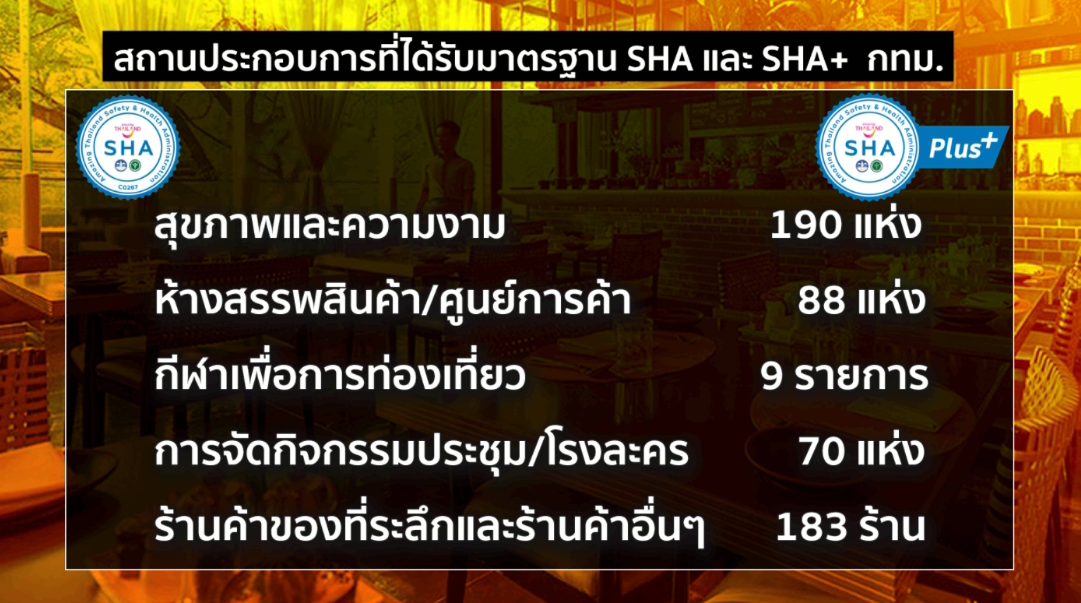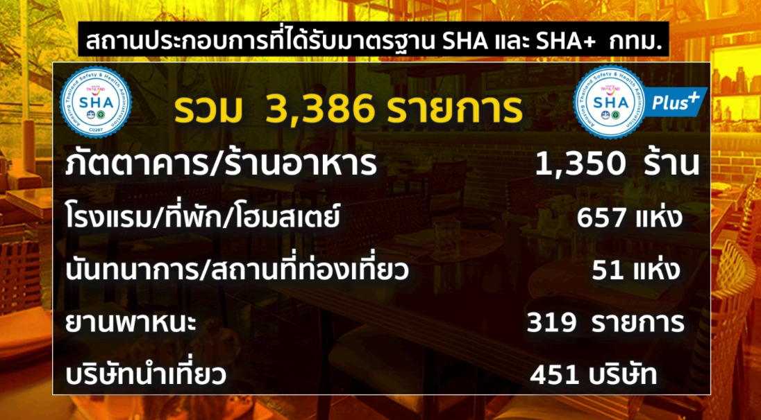 โดยขณะนี้สถานประกอบการที่ได้รับมาตรฐาน SHA และ SHA+ ในกรุงเทพมหานคร มีทั้งหมด 3,386 รายการ