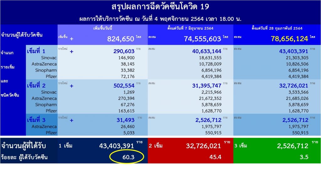 นพ.โอภาส การย์กวินพงศ์ อธิบดีกรมควบคุมโรค กล่าวว่า วันนี้ฉีดวัคซีนโควิด-19 เข็ม 1 ร้อยละ 60 หรือคิดเป็น 43 ล้านโดส เข็ม 2 ร้อยละ 45.4 หรือคิดเป็น 32 ล้านโดส และเข็ม 3 ร้อยละ 3.5 หรือคิดเป็น 2.5 ล้านโดส โดยเป็นวัคซีนซิโนแวค 24 ล้านโดส และแอสตราเซเนกา 34 ล้านโดส ซิโนฟาร์ม 12 ล้านโดส และไฟเซอร์ 6 ล้านโดส ส่วนการฉีดวัคซีนในพื้นที่จังหวัดนำร่องท่องเที่ยว 17 จังหวัด ขณะนี้ฉีดไปแล้ว ร้อยละ80 และเตรียมขยายเพิ่มการฉีดวัคซีนในอีก 16 จังหวัดท่องเที่ยวที่จะเปิดพื้นที่ท่องเที่ยวต่อไปในเดือนธันวาคม