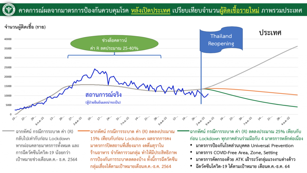 นพ.โอภาส กล่าวว่า แม้สถานการณ์การติดเชื้อลดลง แต่ยังต้องติดตามใน 4 จังหวัดชายแดนใต้ ปัตตานี ยะลา นราธิวาส สงขลา นครศรีธรรมราช และขอนแก่น พร้อมกล่าวว่าในการเปิดประเทศ 1 พ.ย. ยังไม่พบอะไรน่าห่วงกังวล ใน 4 วันที่ผ่านมา โดยยกตัวอย่างอังกฤษให้เป็นประเทศต้นแบบ เนื่องจากมีประชากรใกล้เคียงกับไทย 65-70 ล้านคน และมีการเปิดประเทศพบการติดเชื้อเพิ่มวันละ 30,000 คน แต่อัตราการตายต่ำ พร้อมยอมรับการเปิดกิจกรรมมากขึ้น โอกาสติดเชื้อต้องมีแน่ ๆ ถ้าไม่มีการติดเชื้อเลยจะถือว่าแปลก และแปลว่าไม่สามารถจับสัญญาณติดเชื้อได้ ดังนั้นต้องทำให้ผู้ติดเชื้อมีอาการน้อยที่สุด ซึ่งนี่คงเป็นบทเรียน และบางกิจกรรมไหนไม่จำเป็นก็ไม่ต้องรีบเปิด .-สำนักข่าวไทย