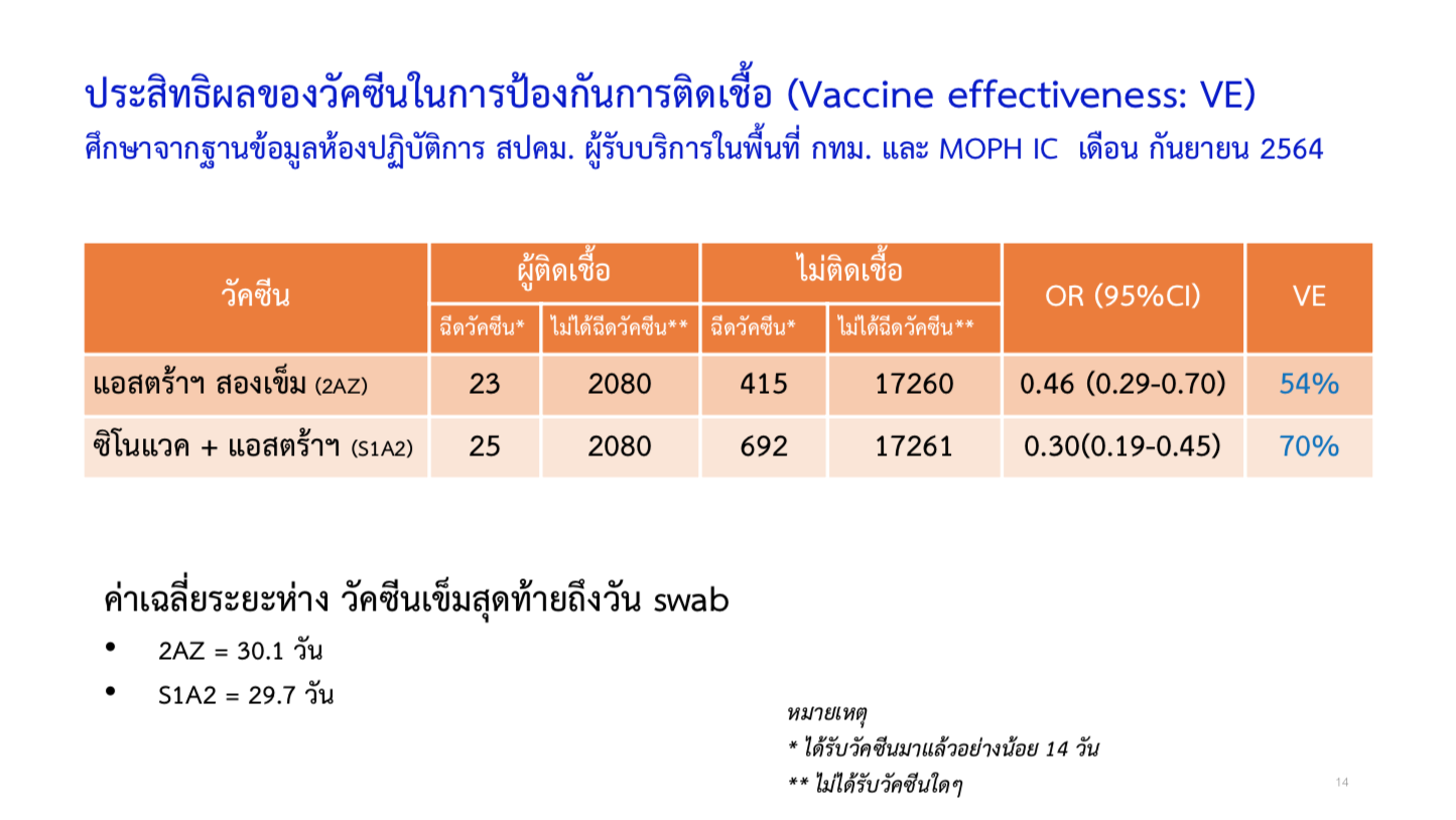 นพ.โอภาส การย์กวินพงศ์ อธิบดีกรมควบคุมโรค กระทรวงสาธารณสุข กล่าวว่า เชื้อเดลตาอยู่กับไทยมานาน 6 เดือนแล้ว และยังไม่ได้พบมีสายพันธุ์ใหม่เกิดขึ้นมาแทน แต่ที่แน่ชัดคือเดลตาทำให้ผลภูมิคุ้มกันในร่างกายของวัคซีนลดลง ดังนั้นกระทรวงสาธารณสุขมีการศึกษาผลการปฏิบัติการของวัคซีน หลังมีการฉีดวัคซีนในสนามจริง โดยใช้ข้อมูลห้องปฏิบัติการของสถาบันควบคุมป้องกันโรคเขตเมือง ในกลุ่มผู้รับบริการในพื้นที่กรุงเทพฯ และข้อมูลจากระบบหมอพร้อมเมื่อเดือน ก.ย.ที่ผ่านมา ซึ่งเป็นเดือนที่มีการระบาดของสายพันธุ์เดลตาสูง พบว่าวัคซีนที่ฉีดใน กทม.มีการฉีด 2 สูตร คือ แอสตราเซเนกา 2 เข็ม พบป้องกันการติดเชื้อ 54% อีกสูตรคือสูตรไขว้ซิโนแวคเข็ม 1 แอสตราฯ เข็ม 2 ป้องกันติดเชื้อได้ 70% จะเห็นว่าสูตรนี้ให้ผลเป็นที่น่าพอใจ และเป็นอีกเหตุผลหนึ่งที่ช่วยให้ กทม. ซึ่งมีการฉีดสูตรนี้เยอะ สามารถลดการระบาดได้ ดังนั้นน่าจะเป็นตัวอย่างให้กับจังหวัดอื่นๆ ที่จะเร่งดำเนินการต่อไป .-สำนักข่าวไทย