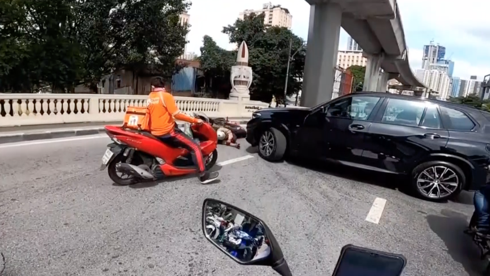 แต่มีรถจักรยานยนต์คันหนึ่งที่ขี่ตามหลัง เบรกและรถเสียหลักล้มกลางสะพาน ท่ามกลางความตกใจของผู้ใช้รถใช้ถนน ก่อนรถหรูป้ายแดงคันดังกล่าว จะขยับรถไปจอดข้างทางและลงมาดูคนเจ็บ