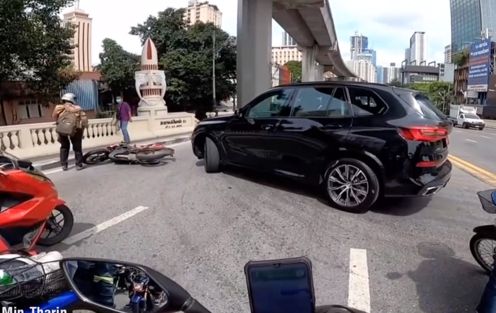 คลิปเหตุการณ์บนท้องถนนที่กำลังวิพากษ์วิจารณ์ในโลกออนไลน์ เมื่อผู้ใช้เฟซบุ๊ก Min Tharin โพสต์คลิปเหตุการณ์ที่กำลังขี่รถจักรยานยนต์มาตามถนน ก่อนมีรถหรูบีเอ็มดับเบิลยูป้ายแดง กลับรถตัดหน้าบนสะพาน ทั้งที่ไม่ใช่จุดให้กลับรถ