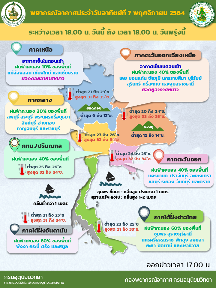 กรมอุตุนิยมวิทยา พยากรณ์อากาศ 24 ชั่วโมงข้างหน้า บริเวณความกดอากาศสูงหรือมวลอากาศเย็นกำลังแรงระลอกใหม่จากประเทศจีนได้แผ่ลงมาปกคลุมภาคตะวันออกเฉียงเหนือของประเทศไทยแล้ว คาดว่าจะแผ่เข้าปกคลุมภาคเหนือ ภาคกลาง ภาคตะวันออก รวมทั้งกรุงเทพมหานคร และปริมณฑล ในวันพรุ่งนี้ (9 พ.ย.64) ลักษณะเช่นนี้ทำให้บริเวณภาคตะวันออกเฉียงเหนือมีอากาศเย็น กับมีลมแรง โดยอุณหภูมิจะลดลง 3-5 องศาเซลเซียส ส่วนภาคเหนือ ภาคกลาง รวมทั้งกรุงเทพมหานคร ปริมณฑล ภาคตะวันออก อ่าวไทย และภาคใต้ มีมรสุมตะวันออกเฉียงเหนือและลมตะวันออกพัดปกคลุม ทำให้บริเวณดังกล่าวมีฝนฟ้าคะนองเกิดขึ้น ขอให้ประชาชนบริเวณประเทศไทยตอนบนดูแลรักษาสุขภาพ เนื่องจากอากาศที่หนาวเย็นลงไว้ด้วย