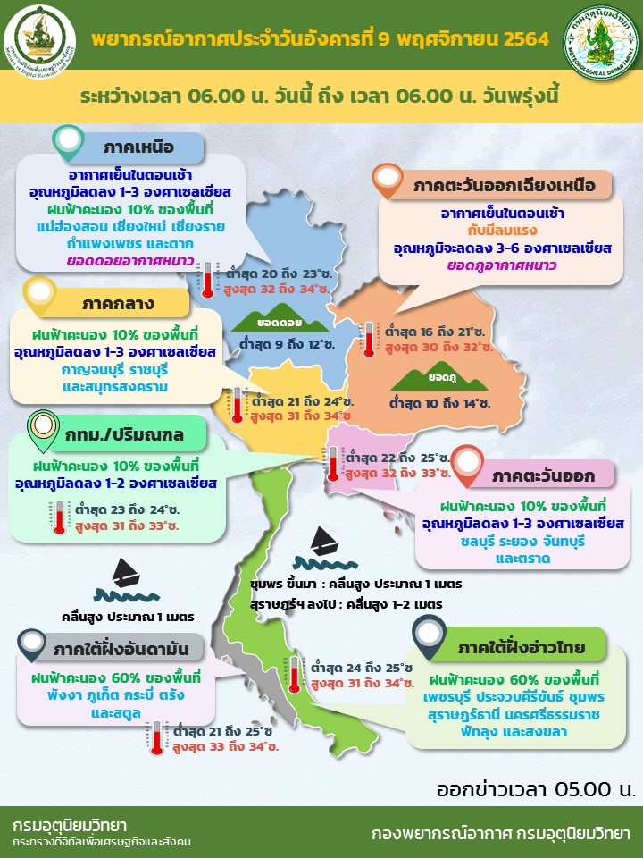 กรมอุตุนิยมวิทยา พยากรณ์อากาศ 24 ชั่วโมงข้างหน้า บริเวณความกดอากาศสูงหรือมวลอากาศเย็นกำลังแรงจากประเทศจีนได้แผ่ลงมาปกคลุมด้านตะวันออกของภาคเหนือ ภาคกลาง และภาคตะวันออกแล้ว ลักษณะเช่นนี้ทำให้บริเวณภาคตะวันออกเฉียงเหนือมีอากาศเย็น กับมีลมแรง โดยอุณหภูมิจะลดลง 3-6 องศาเซลเซียส ส่วนภาคเหนือ ภาคกลาง รวมทั้งกรุงเทพมหานคร ปริมณฑล และภาคตะวันออก ยังมีฝนฟ้าคะนองเกิดขึ้นเป็นบางพื้นที่ และอุณหภูมิจะลดลง 1-3 องศาเซลเซียส ขอให้ประชาชนบริเวณประเทศไทยตอนบนดูแลรักษาสุขภาพ เนื่องจากอากาศที่หนาวเย็นลงไว้ด้วย