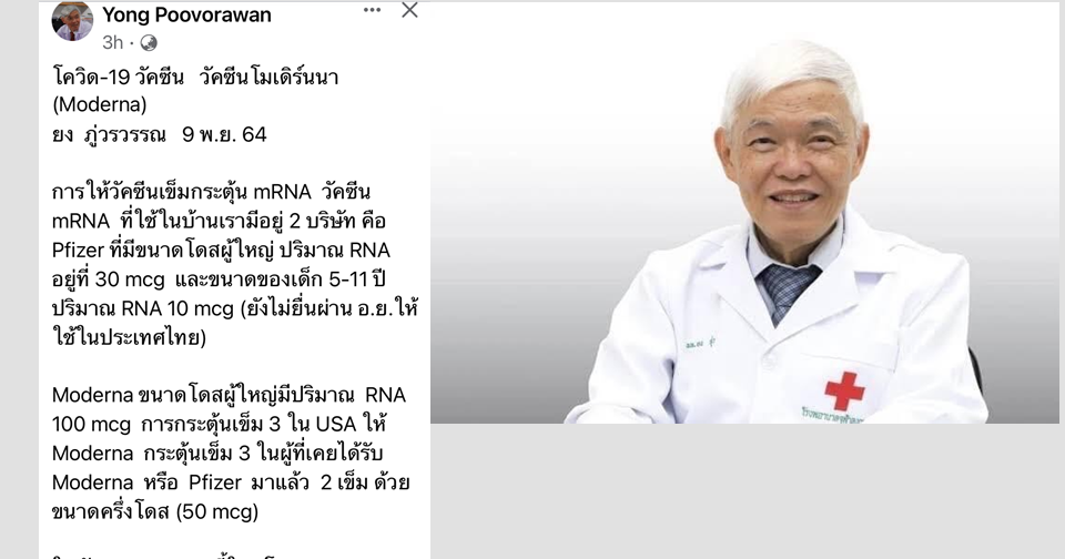 ศ.นพ.ยง ภู่วรวรรณ หัวหน้าศูนย์เชี่ยวชาญเฉพาะทางด้านไวรัสวิทยาคลินิก ภาควิชากุมารเวชศาสตร์ คณะแพทยศาสตร์ จุฬาลงกรณ์มหาวิทยาลัย โพสต์เฟซบุ๊กส่วนตัว Yong Poovorawan วันนี้ (9พ.ย.) เรื่องโควิด-19 วัคซีน วัคซีนโมเดอร์นา (Moderna) ว่า การให้วัคซีนเข็มกระตุ้น mRNA วัคซีน mRNA ที่ใช้ในบ้านเรามีอยู่ 2 บริษัท คือ Pfizer ที่มีขนาดโดสผู้ใหญ่ ปริมาณ RNA อยู่ที่ 30 mcg และขนาดของเด็ก 5-11 ปี ปริมาณ RNA 10 mcg (ยังไม่ยื่นผ่าน อ.ย.ให้ใช้ในประเทศไทย)