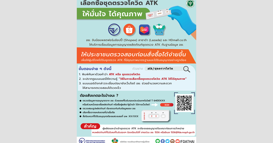 เภสัชกรหญิงสุภัทรา บุญเสริม ผู้ทรงคุณวุฒิด้านมาตรฐานผลิตภัณฑ์ด้านสาธารณสุข รักษาราชการแทนรองเลขาธิการคณะกรรมการอาหารและยา เปิดเผยว่า ตามที่กระทรวงสาธารณสุข (สธ.) อนุญาตให้จำหน่ายชุดตรวจโควิด-19 แบบตรวจหาแอนติเจนด้วยตนเอง (ATK Self Test) ตามร้านค้าและช่องทางออนไลน์ได้ ดังนั้น เพื่อให้ผู้บริโภคได้รับชุดตรวจ ATK ที่มีคุณภาพมาตรฐานและได้รับอนุญาตอย่างถูกต้อง สำนักงานคณะกรรมการอาหารและยา (อย.) จึงร่วมมือกับแพลตฟอร์มออนไลน์ ชอปปี้(Shopee)ลาซาด้า(Lazada)และHDmall.co.th ให้บริการตรวจสอบการอนุญาตชุดตรวจ ATK ที่จะสั่งซื้อว่าได้รับอนุญาตทั้งตัวผลิตภัณฑ์และการโฆษณาจาก อย. แล้วหรือไม่ โดยเมื่อพิมพ์ค้นหาด้วยคำว่า ATK หรือชุดตรวจโควิด จะขึ้นแบนเนอร์ให้ความรู้วิธีการในการเลือกซื้อชุดตรวจโควิด ATK ให้ได้คุณภาพ โดยแบนเนอร์ดังกล่าวจะเชื่อมต่อมายังเว็บไซต์ อย. อำนวยความสะดวกให้สามารถตรวจสอบได้รวดเร็วยิ่งขึ้น