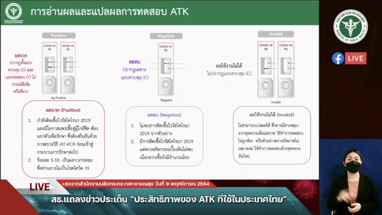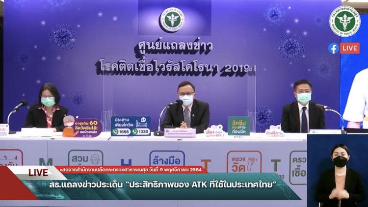 นพ.ศุภกิจ ศิริลักษณ์ อธิบดีกรมวิทยาศาสตร์การแพทย์ กระทรวงสาธารณสุข แถลงเรื่องประสิทธิภาพของ ATK ที่ใช้ในประเทศไทย ขอให้ประชาชนมั่นใจและใช้ ATKที่ได้มาตรฐานรับรองจาก อย.เพื่อไม่เกิดผลบวกลวง โดยวัตถุประสงค์การใช้ คือคนที่มีความเสี่ยงติดเชื้อในที่ชุมชน แต่แนะนำหากเสี่ยงไม่ควรตรวจ ATK ทันที ถ้าเสี่ยงรับเชื้อแต่ยังไม่มีอาการให้กักตัว 3-5 วัน ค่อยตรวจ เว้นแต่จะมีอาการไข้ มีข้อบ่งชี้ จึงตรวจทันที โดยสถานประกอบการฟรีเซตที่ตรวจ ATK ตามมาตรการ covid free setting ย้ำว่าต้องเชคให้ละเอียดว่าเป็น ATK ที่ได้ผ่านการอนุญาตจากอย. และควบคุมปัจจัยวิธีใช้ให้ถูกต้องแม่นยำตามข้อแนะนำ เช่น เก็บจากโพรงจมูกให้เอาไม้แหย่ 2-3 เซนติเมตร ปั่นจมูกข้างละ5รอบ มีC กับTถ้าตัวCไม่ขึ้น ทิ้งทันที ถ้าTขึ้นเป็นบวก แต่มีแบบขึ้นจางๆ คือ ต้องอ่านตามเวลาที่กำหนด หากพบผลบวกลวงหรือ ปลอมมาก ชุดตรวจอาจไม่ได้มาตรฐานหรือใช้ไม่ถูกวิธี ต้องเชคใหม่ ถ้าผลลบลวงเกิดได้เป็นปกติ เพราะ ATK มีความไวกว่าผลตรวจRT สำคัญคือต้องเข้าใจการตรวจ หากเกิดผลลบแต่มีอาการเช่น เป็นไข้ มีน้ำมูก เจ็บคอ ก็ต้องตรวจซ้ำอีก หากกรณีของโรงเรียนถ้าตรวจ ATK แล้วพบผลบวกต้องแจ้ง สธ.พื้นที่ไปสอบสวนโรค เพื่อตรวจซ้ำให้แม่นยำและไม่ตกใจ ย้ำ ATK ที่ใช้ในไทยต้องผ่านการตรวจสอบคุณภาพผ่านอ.ย.เอามาตรฐานเป็นตัวตั้ง ใช้กลไกตลาดทำให้ราคาถูกลง เพื่อให้ตรวจได้บ่อย