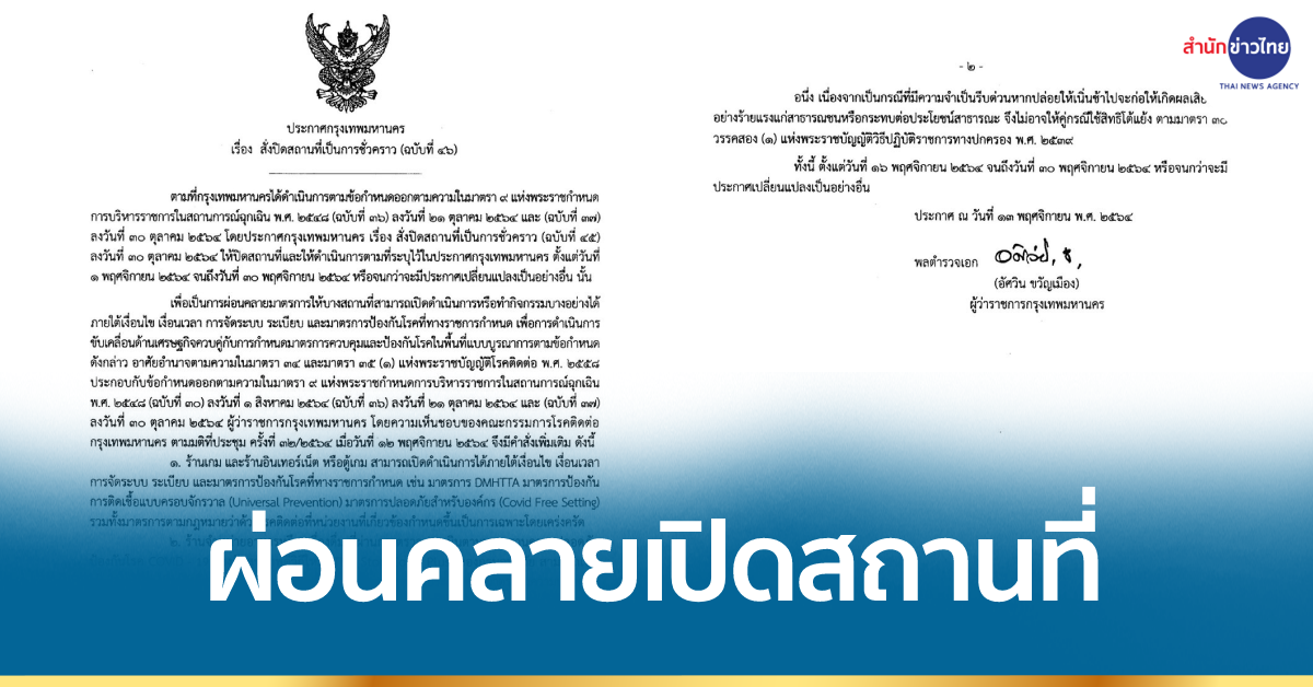ที่ประชุมคณะกรรมการโรคติดต่อกรุงเทพมหานคร ครั้งที่ 32/2564 เมื่อวันที่ 12 พ.ย.64 มีมติเห็นชอบปรับมาตรการป้องกันและควบคุมโรคโควิด-19 ในพื้นที่กรุงเทพมหานคร ตามประกาศกรุงเทพมหานคร เรื่อง สั่งปิดสถานที่เป็นการชั่วคราว (ฉบับที่ 46) เพื่อเป็นการผ่อนคลายมาตรการให้บางสถานที่สามารถเปิดดำเนินการหรือทำกิจกรรมบางอย่างได้ภายใต้เงื่อนไข เงื่อนเวลา การจัดระบบ ระเบียบ และมาตรการป้องกันโรคที่ทางราชการกำหนด และเพื่อการดำเนินการขับเคลื่อนด้านเศรษฐกิจควบคู่กับการกำหนดมาตรการควบคุมและป้องกันโรคในพื้นที่แบบบูรณาการ ดังนี้