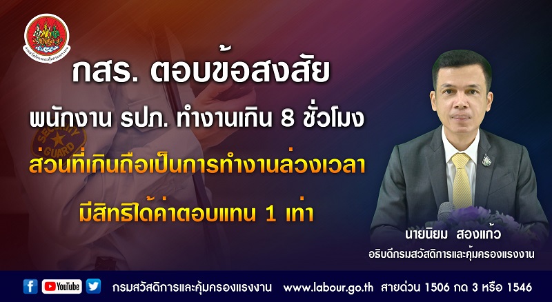 นายนิยม สองแก้ว อธิบดีกรมสวัสดิการและคุ้มครองแรงงาน (อธิบดี กสร.) ชี้แจงว่า กฎหมายคุ้มครองแรงงานกำหนดให้ลูกจ้างทำงานวันละไม่เกิน 8 ชั่วโมง หรือสัปดาห์หนึ่งไม่เกิน 48 ชั่วโมง เนื่องจากมีความมุ่งหมายให้ลูกจ้างได้พักผ่อนใช้เวลากับครอบครัว รวมถึงพัฒนาตนเองตามหลัก 8:8:8 หากนายจ้างประสงค์ให้ลูกจ้างทำงานเกินเวลาปกติหรือทำงานล่วงเวลา ต้องได้รับความยินยอมจากลูกจ้างเป็นคราว ๆ ไป โดยอาจทำเป็นหนังสือก็ได้ ด้วยวาจาก็ได้ หรือทำติดต่อกันไปหากลักษณะงานนั้นถ้าหยุดจะเสียหายแก่งานหรือเป็นงานฉุกเฉิน กรณีนี้ลูกจ้างมีสิทธิได้รับค่าล่วงเวลาในอัตรา 1.5 เท่า สำหรับวันทำงานปกติ หรือ 3 เท่า สำหรับการทำงานล่วงเวลาในวันหยุด