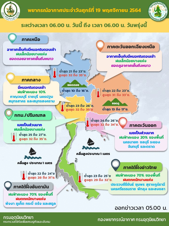 ภาคเหนือ : อากาศเย็นกับมีหมอกในตอนเช้า โดยมีฝนเล็กน้อยบางแห่ง อุณหภูมิต่ำสุด 21-23 องศาเซลเซียส อุณหภูมิสูงสุด 32-35 องศาเซลเซียส ยอดดอยอากาศเย็นถึงหนาว อุณหภูมิต่ำสุด 10-16 องศาเซลเซียส