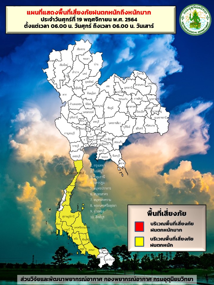 ภาคใต้ (ฝั่งตะวันตก) : มีฝนฟ้าคะนองร้อยละ 70 ของพื้นที่ กับมีฝนตกหนักบางแห่ง บริเวณจังหวัดพังงา ภูเก็ต กระบี่ ตรัง และสตูล อุณหภูมิต่ำสุด 22-24 องศาเซลเซียส อุณหภูมิสูงสุด 28-31 องศาเซลเซียส ลมตะวันออก ความเร็ว 15-30 กม./ชม. ทะเลมีคลื่นสูงประมาณ 1 เมตร ห่างฝั่งคลื่นสูง 1-2 เมตร.-สำนักข่าวไทย