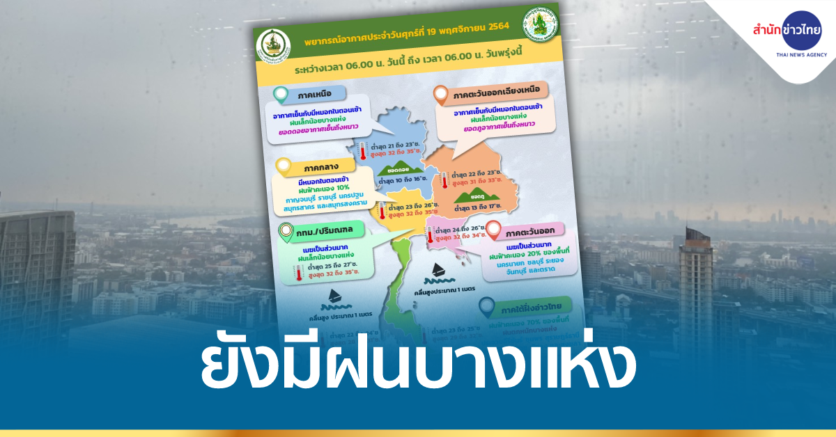 กรุงเทพฯ 19 พ.ย.-กรมอุตุฯ เผยภาคอีสานตอนล่าง ภาคตะวันออก และภาคกลาง มีฝนเกิดขึ้นได้ในระยะนี้ ขณะที่ภาคใต้ยังมีฝนตกต่อเนื่องและฝนตกหนักบางแห่ง ส่วน กทม.-ปริมณฑล ฝนเล็กน้อยบางแห่ง
