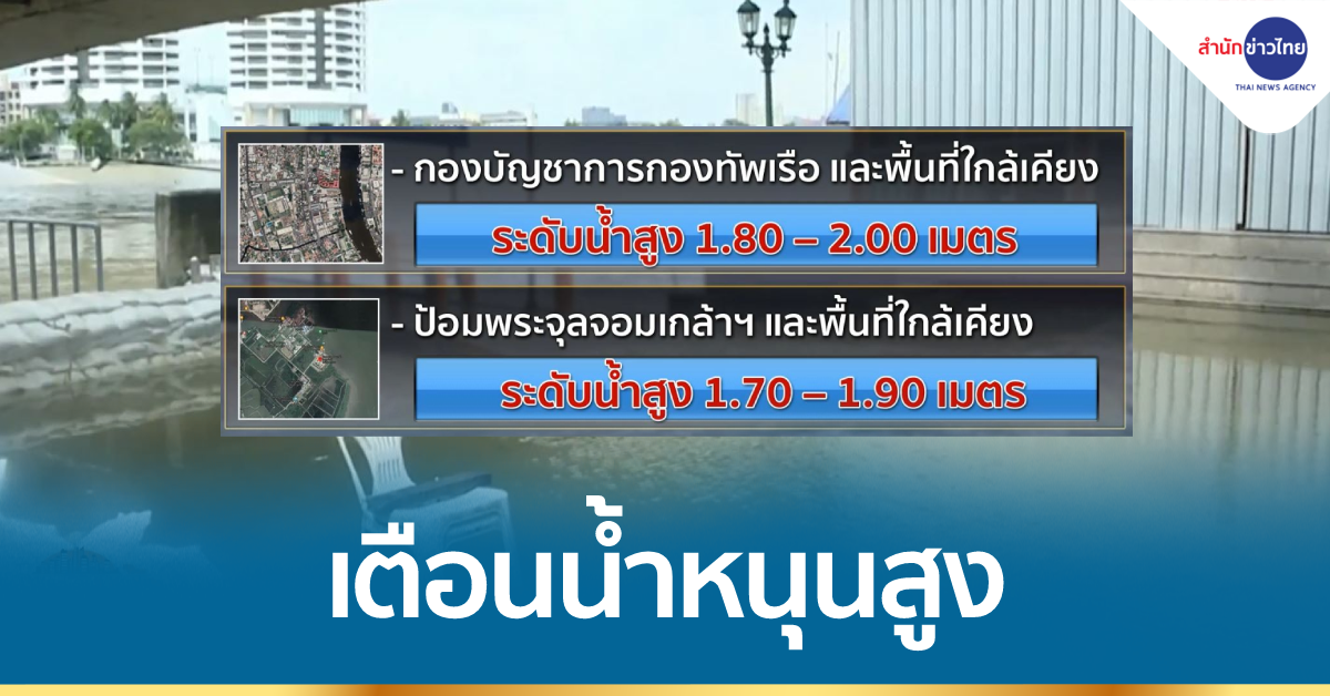 บริเวณกองบัญชาการกองทัพเรือ และพื้นที่ใกล้เคียง ระดับน้ำจะมีความสูง ประมาณ 1.80 – 2.00 เมตร จากระดับทะเลปานกลาง และบริเวณป้อมพระจุลจอมเกล้าฯ และพื้นที่ใกล้เคียง ระดับน้ำจะมีความสูง ประมาณ 1.70 – 1.90 เมตร จากระดับทะเลปานกลาง จึงขอให้ระมัดระวังผลกระทบที่จะเกิดขึ้นจากระดับน้ำขึ้นสูงดังกล่าว และติดตามสภาวะระดับน้ำอย่างใกล้ชิด.-สำนักข่าวไทย