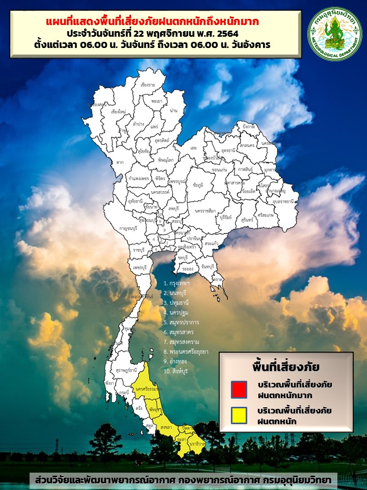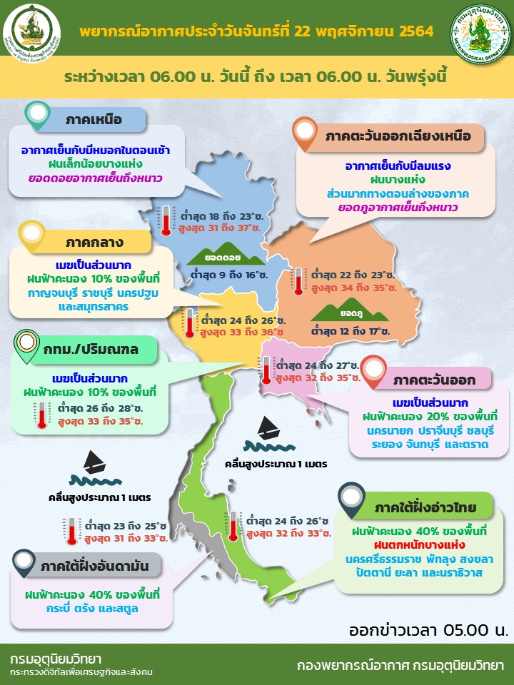 กรมอุตุนิยมวิทยา พยากรณ์อากาศ 24 ชั่วโมงข้างหน้า บริเวณความกดอากาศสูงกำลังค่อนข้างแรงระลอกใหม่จากประเทศจีนได้แผ่ลงมาปกคลุมถึงเวียดนามตอนบนแล้ว คาดว่าจะแผ่ลงมาปกคลุมภาคตะวันออกเฉียงเหนือของประเทศไทย ในวันนี้ (22 พ.ย.64) ทำให้บริเวณดังกล่าวมีฝนบางแห่ง หลังจากนั้นอุณหภูมิจะลดลง 3-5 องศาเซลเซียส และมีอากาศเย็นถึงหนาว กับมีลมแรง ส่วนภาคเหนือ ภาคกลาง และภาคตะวันออก จะได้รับผลกระทบในระยะต่อไป โดยอุณหภูมิจะลดลง 2-4 องศาเซลเซียส ขอให้ประชาชนบริเวณประเทศไทยตอนบนดูแลสุขภาพ เนื่องจากสภาพอากาศที่เปลี่ยนแปลงไว้ด้วย