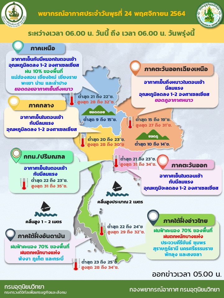 กรมอุตุนิยมวิทยา พยากรณ์อากาศ 24 ชั่วโมงข้างหน้า บริเวณความกดอากาศสูงหรือมวลอากาศเย็นกำลังค่อนข้างแรงปกคลุมภาคตะวันออกเฉียงเหนือของประเทศไทยและทะเลจีนใต้ ทำให้บริเวณภาคตะวันออกเฉียงเหนือมีอากาศเย็นถึงหนาว กับมีลมแรง ส่วนภาคเหนือ ภาคกลาง และภาคตะวันออก มีอากาศเย็นในตอนเช้า กับมีลมแรง โดยอุณหภูมิจะลดลงอีก 1-2 องศาเซลเซียส ขอให้ประชาชนบริเวณประเทศไทยตอนบนดูแลรักษาสุขภาพ เนื่องจากสภาพอากาศที่เปลี่ยนแปลงไว้ด้วย