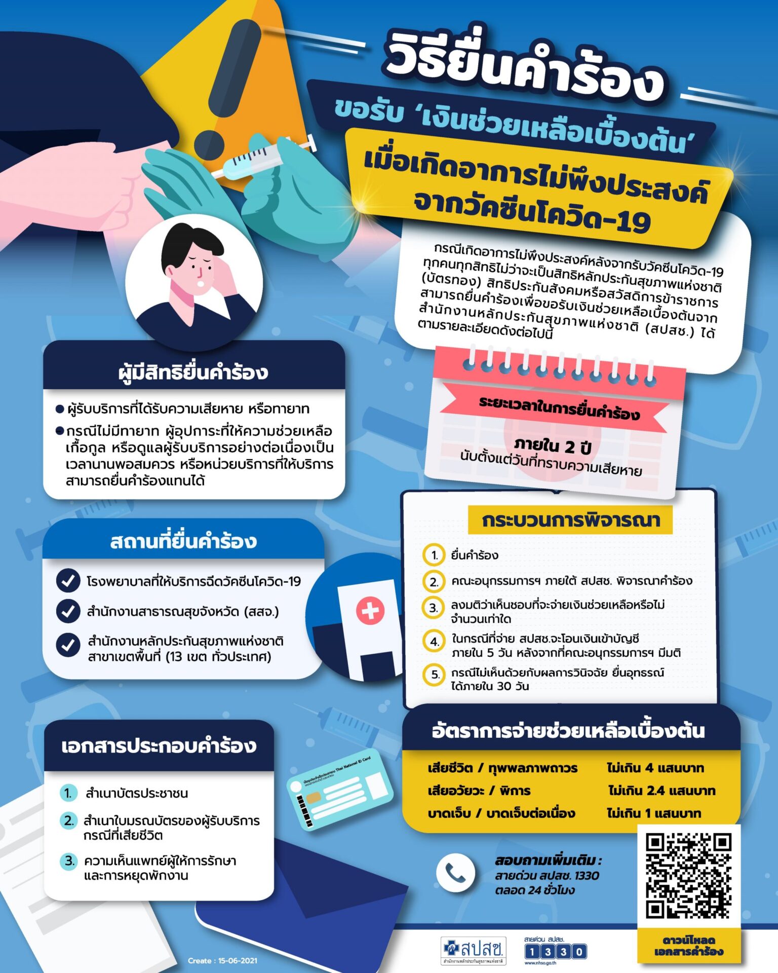 ทั้งนี้ ในกรณีได้รับความเสียหายหรือเกิดอาการไม่พึงประสงค์หลังรับวัคซีนโควิด-19 ที่ภาครัฐจัดให้ หลักเกณฑ์การจ่ายเงินช่วยเหลือ คือ กรณีเสียชีวิตหรือทุพพลภาพถาวร จะได้รับการช่วยเหลือไม่เกิน 400,000 บาท กรณีสูญเสียอวัยวะหรือพิการช่วยเหลือไม่เกิน 240,000 บาท และกรณีเกิดภาวะเจ็บป่วยที่ต้องรับการรักษาไม่เกิน 1 แสนบาท ซึ่งจะช่วยเหลือจำนวนเท่าใดนั้น เป็นการพิจารณาของอนุกรรมการฯ ตามภาวะความรุนแรง ซึ่งในกรณีที่ผู้ยื่นคำร้องไม่เห็นด้วยกับผลการวินิจฉัย ก็มีสิทธิยื่นอุทธรณ์ต่อเลขาธิการ สปสช. ได้ภายใน 30 วัน นับแต่วันที่ทราบผลการวินิจฉัย โดยสามารถยื่นเรื่องขอรับเงินช่วยเหลือเบื้องต้นกับ สปสช.ได้ที่โรงพยาบาลที่ฉีด หรือสำนักงานสาธารณสุขจังหวัด (สสจ.) หรือที่ สปสช.สาขาเขตพื้นที่ทั้ง 13 เขต โดยมีระยะเวลายื่นคำร้องได้ภายใน 2 ปีนับแต่วันที่ทราบความเสียหาย สอบถามเพิ่มเติม สายด่วน สปสช. โทร. 1330