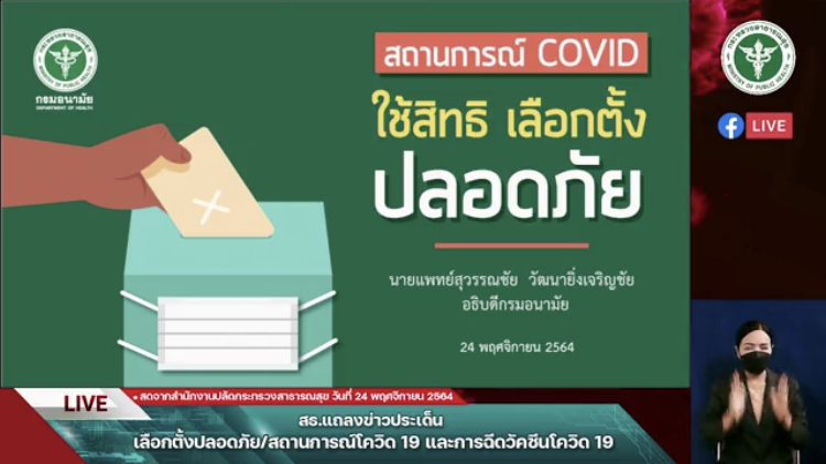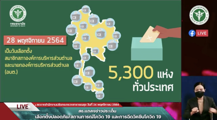 นพ.สุวรรณชัย วัฒนายิ่งเจริญชัย อธิบดีกรมอนามัย กระทรวงสาธารณสุข (สธ.) กล่าวเน้นย้ำมาตรการป้องกันโควิด-19 ในการไปเลือกตั้งสมาชิกสภาองค์การบริหารส่วนตำบลและนายกองค์การบริหารส่วนตำบล ทั่วประเทศ ในวันที่ 28 พ.ย.นี้ ว่า มี อบต.ถึง 5,300 แห่งทั่วประเทศ ที่จะจัดให้มีการเลือกตั้ง ซึ่งมีความสุ่มเสี่ยงอาจทำให้เกิดการระบาดโควิดขึ้นได้ จากประชาชนส่วนที่เดินทางมาจากต่างจังหวัดเพื่อกลับมาลงคะแนนเสียง และจากการใช้พื้นที่ร่วมกัน มีจุดสัมผัสร่วมกัน เช่น ปากกา กระดาษ และโต๊ะที่ใช้ในหน่วยเลือกตั้ง รวมถึงสุขอนามัยสิ่งแวดล้อมของสถานที่ ก็เป็นสิ่งที่ต้องจัดการให้เกิดความปลอดภัย โดยมีมาตรการที่ควรเน้นย้ำ กับเจ้าพนักงานที่หน่วยเลือกตั้งและประชาชนที่ไปใช้สิทธิ์ เพื่อลดโอกาสในการแพร่ระบาด