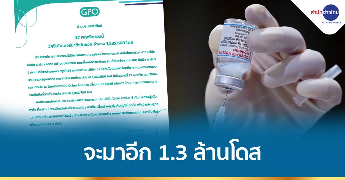 กทม. 24 พ.ย.-องค์การเภสัชฯ เผย ซิลลิค ฟาร์มา แจ้งว่าวัคซีนโมเดอร์นา จะมาอีก 1.3 ล้านโดส ถึงไทยวันที่ 27 พ.ย.64