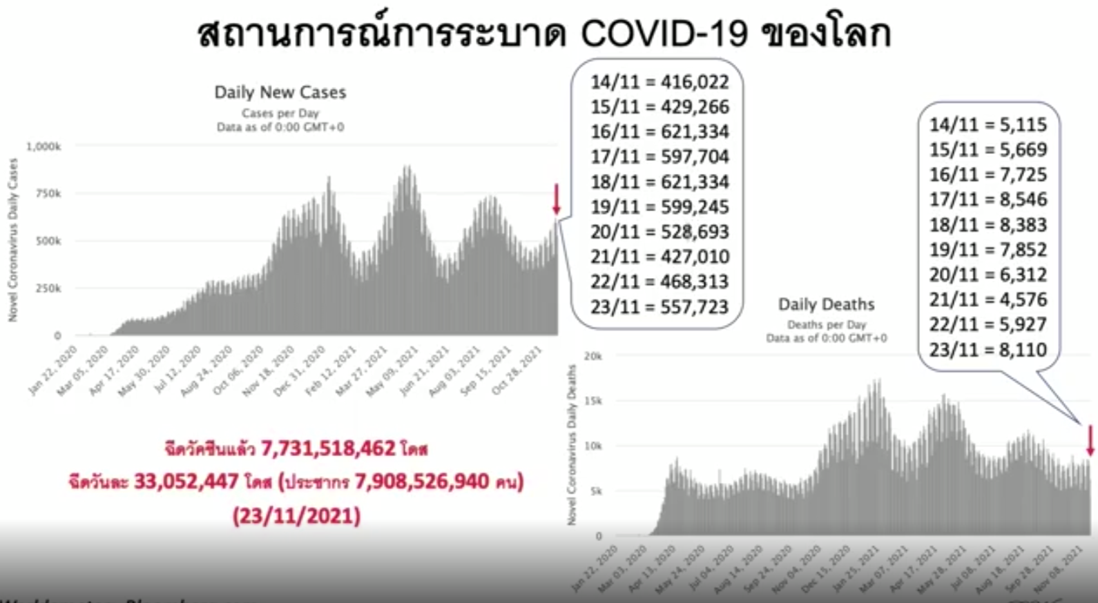 ศ.นพ.ประสิทธิ์ วัฒนาภา คณบดีคณะแพทยศาสตร์ศิริราชพยาบาล กล่าวอัปเดตสถานการณ์โควิด-19 ว่าเปรียบเทียบสถานการณ์โควิด-19 ทั่วโลก โดยระบุแม้ทั่วโลกมีการฉีดวัคซีนเกิน 70% ทั้งครบโดส และเข็ม 1 และเริ่มมีการกระตุ้นวัคซีนเข็ม 3 แต่ยังพบว่าการติดเชื้อ และเสียชีวิตมากอยู่เนื่องจากวัฒนธรรม ความเชื่อ การใช้ชีวิต ห่วงเดือนธันวาคมเป็นจุดเปลี่ยนติดเชื้อเพิ่มขึ้น ทั่วโลก เนื่องจากสถานการณ์ ช่วงที่ทวีปยุโรป มีอากาศหนาวเย็น มีวันหยุดยาว และมีคนรวมตัวพบะปะสังสรรค์ เพื่อเฉลิมฉลองเทศกาลปีใหม่ ดังนั้นเรียกร้องขอให้เร่งรัดมาตรการ ทั้งระยะห่าง และสวมหน้ากากอนามัย เพื่อไม่ให้อัตราการติดเชื้อกลับมาพุ่งสูง เพราะในบางประเทศล่าสุด เช่น ออสเตรีย เพิ่งมีการประกาศล็อกดาวน์ เนื่องจากมีอัตราการติดเชื้อ 925 ต่อแสนประชากร และมีอัตราเสียชีวิตเพิ่มสูง แม้มีอัตราการรับวัคซีนในประเทศสูงเกือบ 70%