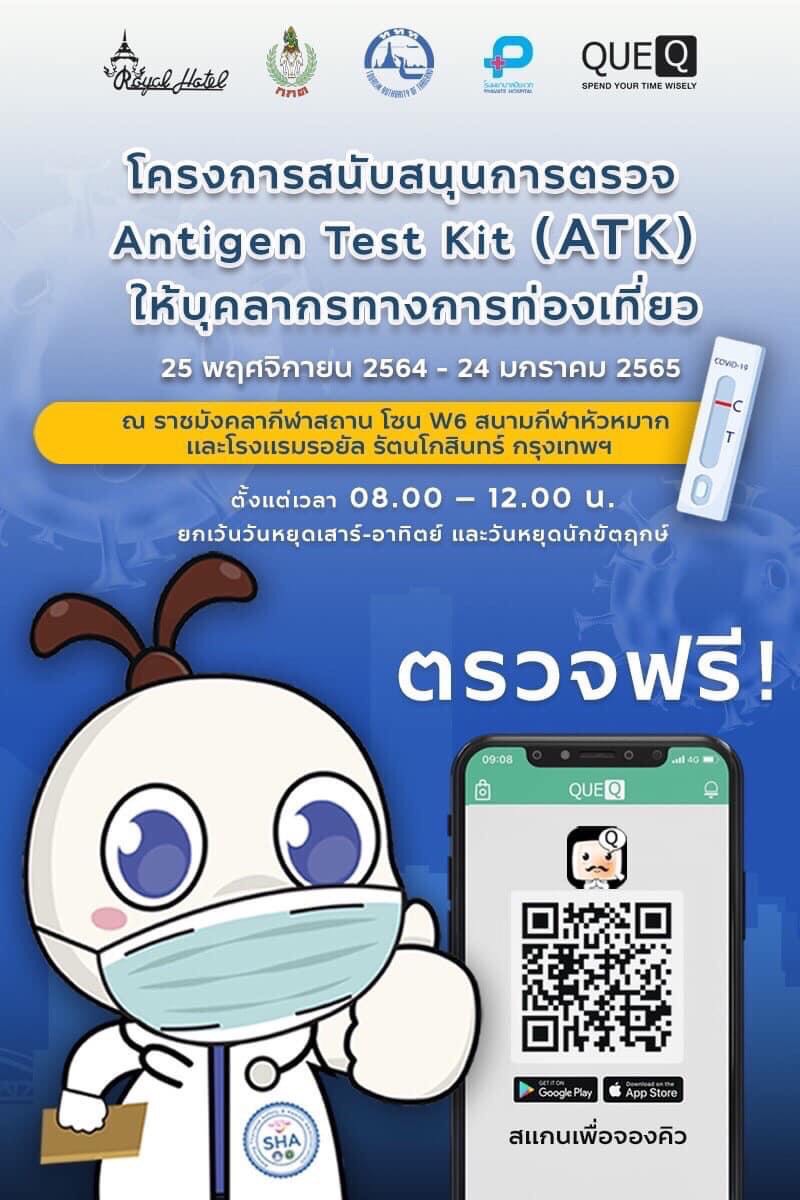 สำหรับจุดให้บริการตรวจ ATK ทั้ง 2 แห่ง คือ บริเวณราชมังคลากีฬาสถาน โซน W6 สนามกีฬาหัวหมาก รับตรวจวันละ500 คน และโรงแรมรอยัล รัตนโกสินทร์ กรุงเทพฯ รับตรวจวันละ 500 คน โดยเปิดให้บริการตั้งแต่ 25 พ.ย.64 ไปจนถึง 24 ม.ค.65 รวมทั้งหมด จำนวน 60,000 ชุด ตั้งแต่เวลา 08.00 – 12.00 น. ยกเว้นวันหยุดเสาร์ – อาทิตย์ และวันหยุดนักขัตฤกษ์ โดยไม่เสียค่าใช้จ่าย แต่ต้องจองคิวล่วงหน้าผ่านแอปพลิเคชั่น QueQ เพื่อลดความแออัด และควบคุมความหนาแน่นของผู้เข้ารับการตรวจ และหากผลการตรวจพบว่าติดเชื้อ จะมีการส่งต่อเข้าสู่ระบบการรักษาแบบครบวงจร โดยไม่คิดค่าใช้จ่ายเช่นกัน.-สำนักข่าวไทย
