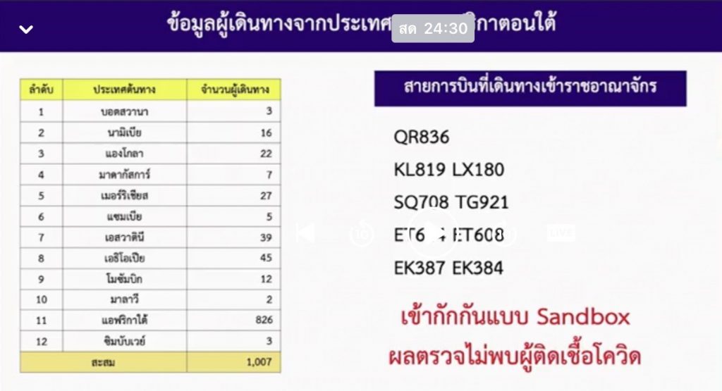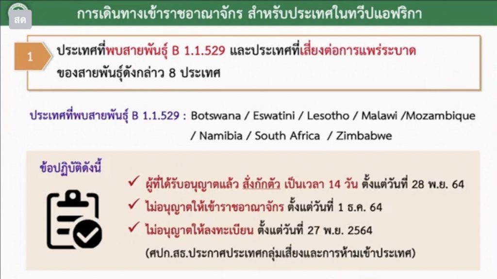 ด้านนายแพทย์โอภาส การย์กวินพงศ์ อธิบดีกรมควบคุมโรค เผยถึงมาตรการการเดินทางเข้าราชอาณาจักรไทยสำหรับประเทศในทวีป แอฟริกา ที่พบเชื้อกลายพันธุ์ โดย แบ่งเป็น 1. กลุ่มที่มาจาก 8 ประเทศเสี่ยงสูงที่พบการระบาด โอไมครอน ( Botswana Eswatini Lesotho Malawi Mozambique Namibia South Africa Zimbabwe) ผู้ที่ได้รับอนุญาตให้เข้าไทยมาแล้ว ต้องเพิ่มวันกักตัวเป็น 14 วัน ตั้งแต่ 28 พ.ย.64 และไม่อนุญาตให้ผู้ที่มาจาก 8 ประเทศดังกล่าวเข้าไทย ตั้งแต่ 1 ธันวาคม 2564 และไม่อนุญาตให้มีการลงทะเบียนเข้าไทยผ่านระบบต่างๆตั้งแต่วันที่ 27 พ.ย.64 2.ประเทศอื่นๆในทวีปแอฟริกา 63 ประเทศ จะไม่อนุญาตให้เข้ามาในรูปแบบ Test and Go (กต.ไม่ได้ประกาศประเทศเหล่านี้) ไม่อนุญาตให้เข้ามาในรูปแบบ Sand Box หากมีที่เข้ามาแล้วต้องอยู่ในสถานกักตัวที่กำหนด 14 วัน และต้องตรวจเชื้อ 3 ครั้งในระหว่างกักตัว ผู้ที่ได้รับอนุญาตทุกประเภท ให้ดำเนินการตามที่ได้รับอนุญาต จนถึง 15 ธ.ค.64 แต่ต้องกักตัวให้ครบ 14 วัน และไม่อนุญาตให้ลงทะเบียนเข้ามาไทยผ่านระบบต่างๆ ตั้งแต่วันที่ 27 พ.ย.64 โดยข้อมูลที่ผ่านมามีผู้ที่เดินทางจากทวีปแอฟริกา 12 ประเทศ จำนวน 1,007 คน เข้ากักตัวแบบ SandBox ทั้งหมดไม่พบว่าติดเชื้อโควิด