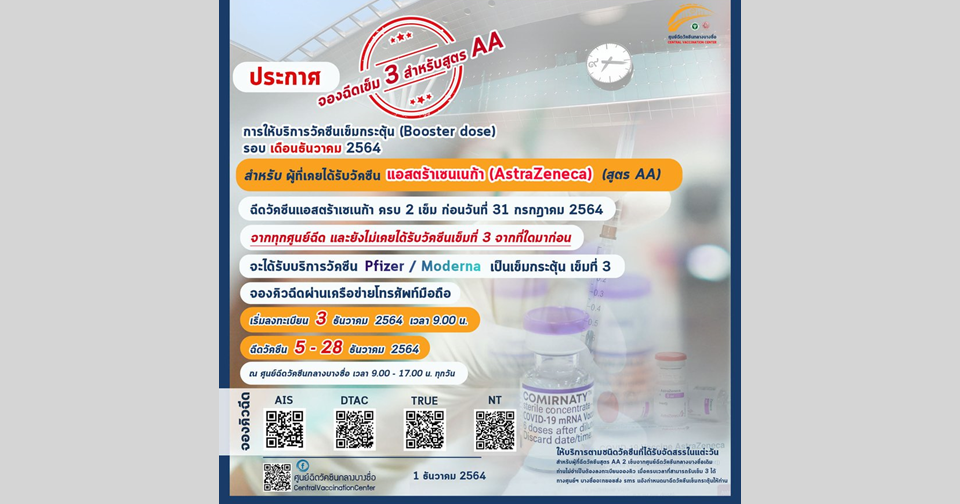 วัคซีนที่จะได้รับเข็มที่ 3 เป็นชนิดวัคซีนไฟเซอร์ หรือโมเดอร์นา (Pfizer/Moderna) ตามที่ศูนย์ฯ จะได้รับจัดสรรจากกรมควบคุมโรค โดยเริ่มลงทะเบียนในวันที่ 3 ธ.ค.64 ตั้งแต่เวลา 09.00 น.ผ่านเครือข่ายมือถือ และจะเริ่มฉีดวัคซีนตั้งแต่วันที่ 5-28 ธ.ค.64 ณ ศูนย์ฉีดวัคซีนกลางบางซื่อ เวลา 09.00-17.00 น.ทุกวัน