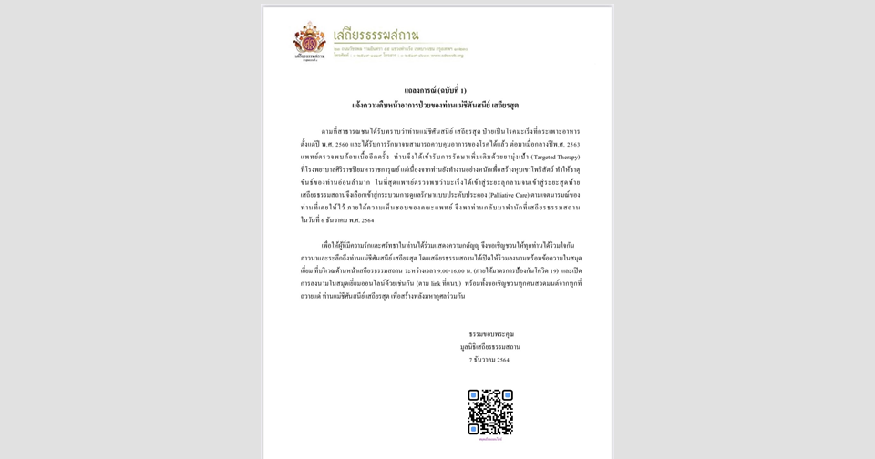พร้อมทั้งขอเชิญชวนทุกคนสวดมนต์จากทุกที่ถวายแด่ แม่ชีศันสนีย์ เสถียรสุต เพื่อสร้างพลังมหากุศลร่วมกัน