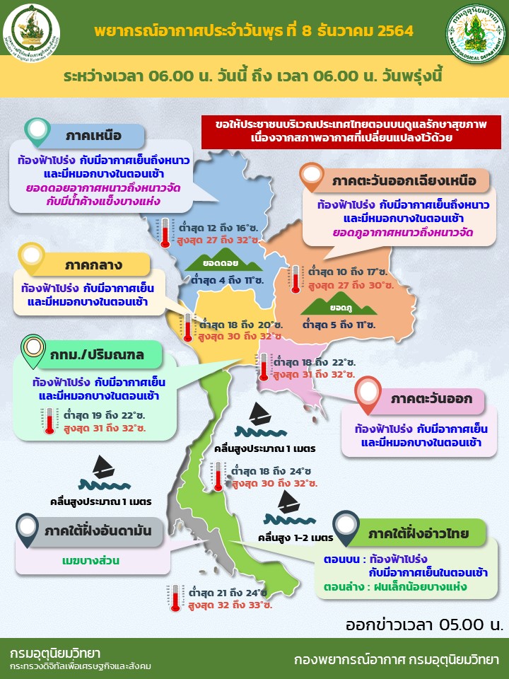 กรมอุตุนิยมวิทยา พยากรณ์อากาศ 24 ชั่วโมงข้างหน้า บริเวณความกดอากาศสูงหรือมวลอากาศเย็นที่ปกคลุมประเทศไทยเริ่มมีกำลังอ่อนลง ลักษณะเช่นนี้ทำให้บริเวณประเทศไทยตอนบนมีหมอกบางในตอนเช้า แต่ยังคงมีอากาศเย็นถึงหนาวในภาคเหนือและภาคตะวันออกเฉียงเหนือ ส่วนภาคกลางและภาคตะวันออก อากาศเย็น สำหรับยอดดอยมีอากาศหนาวถึงหนาวจัด กับมีน้ำค้างแข็งบางแห่ง อุณหภูมิต่ำสุด 4-11 องศาเซลเซียส และยอดภูมีอากาศหนาวถึงหนาวจัด อุณหภูมิต่ำสุด 5-11 องศาเซลเซียส ขอให้ประชาชนบริเวณประเทศไทยตอนบนดูแลรักษาสุขภาพ เนื่องจากสภาพอากาศที่หนาวเย็นลง และระวังอันตรายในการสัญจรผ่านบริเวณที่มีหมอกไว้ด้วย