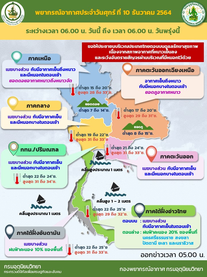 กรมอุตุฯ 10 ธ.ค. – กรมอุตุฯ เผยภาคเหนือและภาคอีสาน อากาศเย็นถึงหนาว กับมีหมอกบางตอนเช้า ยอดดอยอากาศหนาวถึงหนาวจัด ส่วนภาคกลาง ภาคตะวันออก รวมทั้งกรุงเทพฯ และปริมณฑล อากาศเย็น อุณหภูมิสูงขึ้นอีกเล็กน้อย