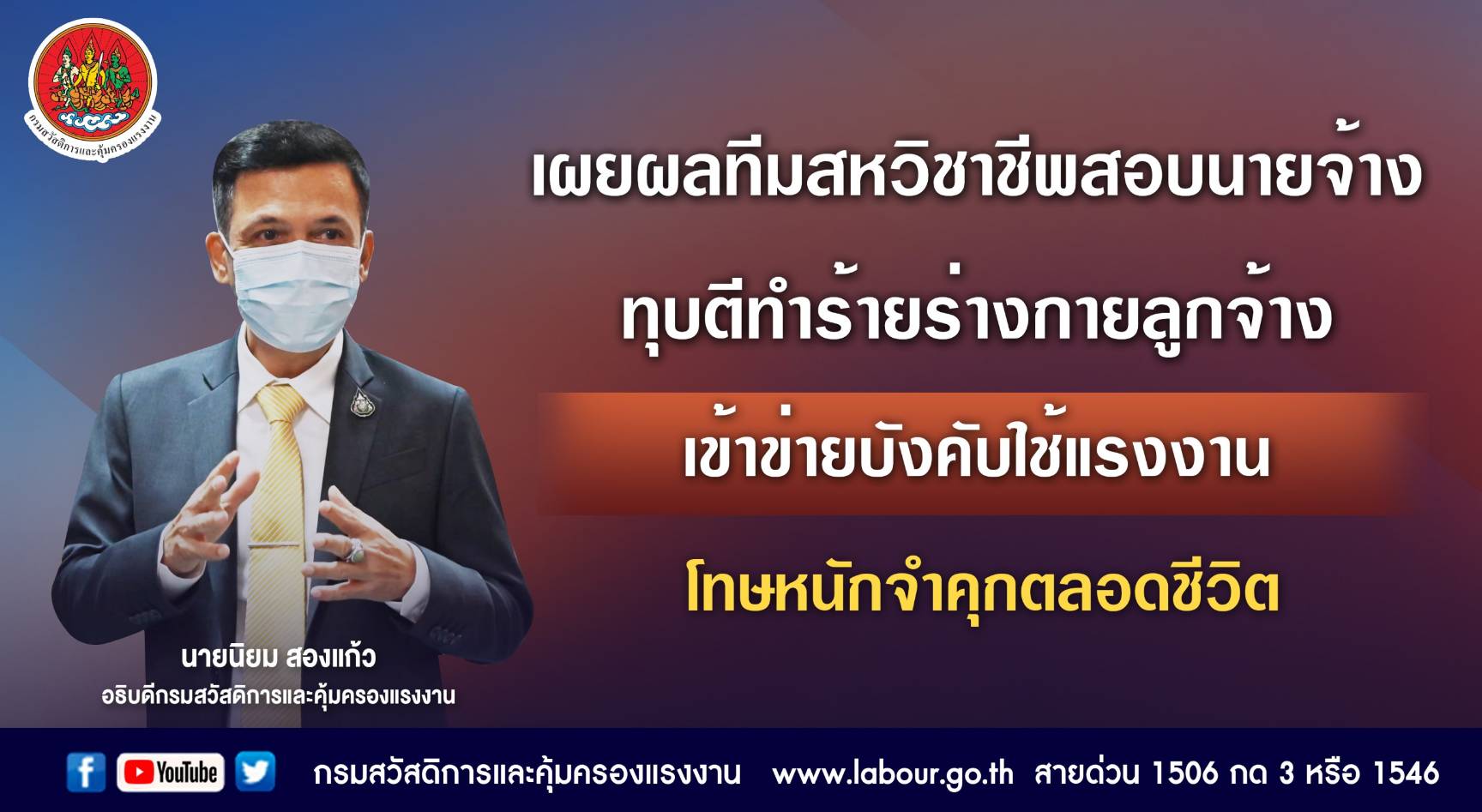 กทม. 10 ธ.ค.-อธิบดี กสร. เผยผลสอบข้อเท็จจริงคณะทำงานสหวิชาชีพ กรณีนายจ้างทำร้ายร่างกายทุบตีกระทำทารุณกรรมต่อลูกจ้างที่จังหวัดสิงห์บุรี เข้าข่ายบังคับใช้แรงงานหรือบริการ มีโทษจําคุก ตั้งแต่ 8 – 20 ปี และปรับตั้งแต่ 800,000 – 2,000,000 บาท หรือจําคุกตลอดชีวิต