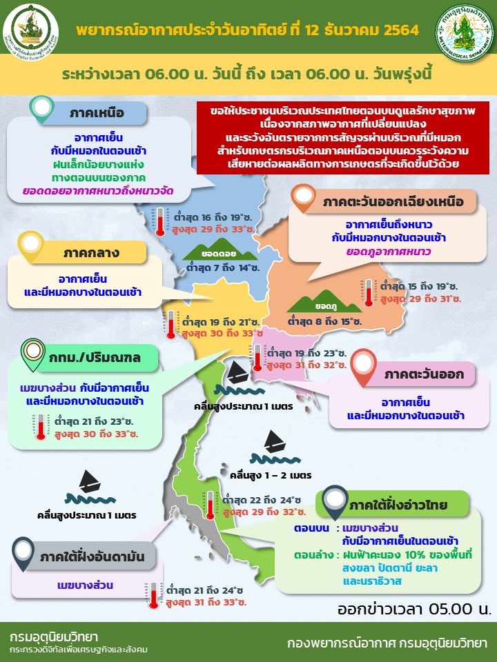 กรมอุตุนิยมวิทยาเผยบริเวณความกดอากาศสูงหรือมวลอากาศเย็นกำลังปานกลางยังคงปกคลุมประเทศไทยตอนบน ลักษณะเช่นนี้ทำให้ ภาคตะวันออกเฉียงเหนือ มีอากาศเย็นถึงหนาว ส่วนภาคเหนือ ภาคกลาง และภาคตะวันออก ยังคงมีอากาศเย็น กับมีหมอกบางในตอนเช้า สำหรับยอดดอยมีอากาศหนาวถึงหนาวจัด อุณหภูมิต่ำสุด 7-14 องศาเซลเซียส และยอดภูมีอากาศหนาว อุณหภูมิต่ำสุด 8-15 องศาเซลเซียส ขอให้ประชาชนบริเวณประเทศไทยตอนบนดูแลรักษาสุขภาพเนื่องจากสภาพอากาศที่เปลี่ยนแปลง และระมัดระวังอันตรายจากการสัญจรผ่านบริเวณที่มีหมอก สำหรับเกษตรกรบริเวณภาคเหนือตอนบนควรระวังความเสียหายต่อผลผลิตทางการเกษตรที่จะเกิดขึ้นไว้ด้วย สำหรับมรสุมตะวันออกเฉียงเหนือที่พัดปกคลุมอ่าวไทยและภาคใต้มีกำลังอ่อนลง ลักษณะเช่นนี้ทำให้ภาคใต้มีฝนน้อย โดยมีฝนฟ้าคะนองบางแห่งทางตอนล่างของภาค