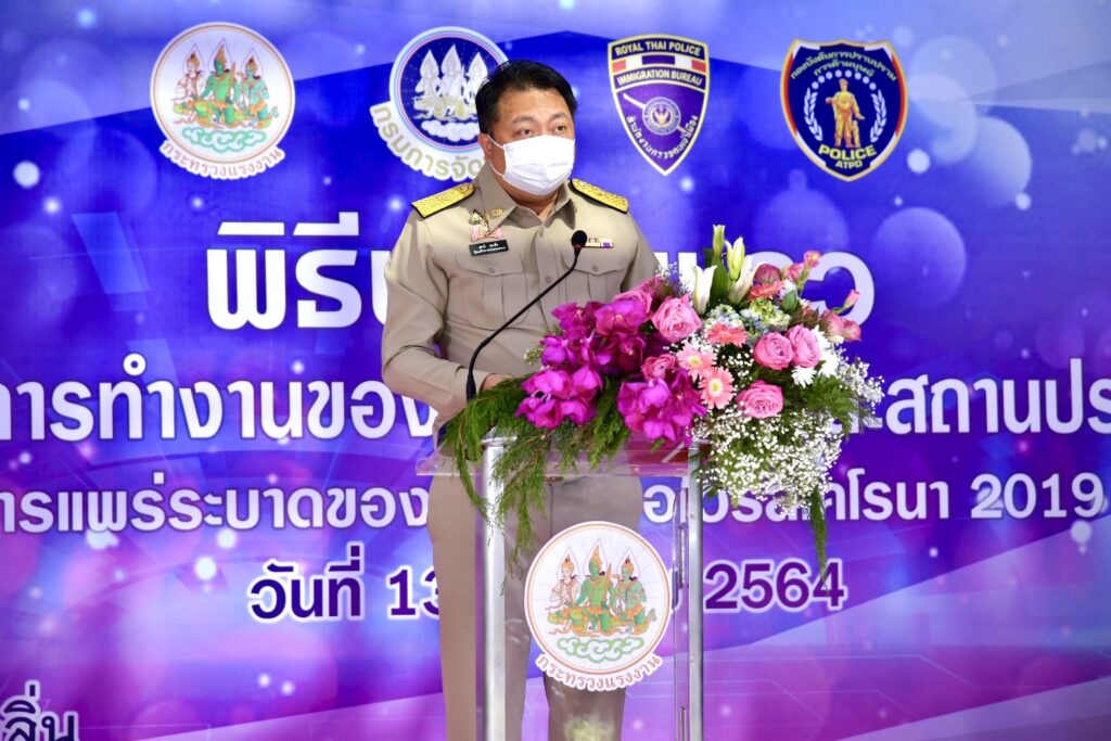 ด้านนายสมชาย มรกตศรีวรรณ รองอธิบดีกรมการจัดหางาน กล่าวว่า นายไพโรจน์ โชติกเสถียร อธิบดีกรมการจัดหางาน มอบหมายตนกล่าวรายงานในพิธีปล่อยแถวเจ้าหน้าที่ด้านการตรวจสอบการทำงานของคนต่างด้าวและสถานประกอบการ ซึ่งในวันนี้มีท่านรัฐมนตรีสุชาติ ชมกลิ่น กรุณาให้เกียรติมอบนโยบายและเป็นประธานในพิธี เพื่อเป็นขวัญกำลังใจ และมอบแนวทางให้เจ้าหน้าที่นำไปปฎิบัติงาน โดยที่ผ่านมากรมการจัดหางานได้ลงพื้นที่ตรวจสถานประกอบการตามมติครม.วันที่ 28 ก.ย. 64 เพื่อให้คำแนะนำการปฏิบัติตนตามมาตรการทางสาธารณสุขแก่นายจ้างและแรงงานข้ามชาติ ที่มีสถานะไม่ถูกต้องตามกฎหมาย กำหนดระยะเวลา 30 วัน ตั้งแต่วันที่ 1 – 30 พฤศจิกายน 64 โดยเจ้าหน้าที่จะทำแบบบันทึกข้อมูล และให้นายจ้างมาดำเนินการยื่นคำขออนุญาตทำงานแทนแรงงานข้ามชาติ ภายใน 7 วัน หลังได้รับแบบบันทึกข้อมูลแรงงานข้ามชาติจากเจ้าหน้าที่ ซึ่งปัจจุบัน พ้นระยะเวลาดำเนินการตามที่กำหนดแล้ว แต่พบว่ายังมีแรงงานข้ามชาติ ที่นายจ้าง สถานประกอบการยังไม่มาดำเนินการ 64,472 ราย คิดเป็นร้อยละ 18.22 จากจำนวนที่เจ้าหน้าที่เข้าตรวจสถานประกอบและบันทึกข้อมูลไว้ทั้งสิ้น 353,776 ราย ซึ่งทำให้กลุ่มดังกล่าวกลายเป็นแรงงานข้ามชาติที่มีสถานะผิดกฎหมายทันที โดยเจ้าหน้าที่ด้านการตรวจสอบการทำงานของคนต่างด้าวและสถานประกอบการ จะเริ่มปฏิบัติงานโดยมีเป้าหมายตรวจสอบกลุ่มดังกล่าวเป็นกลุ่มแรก