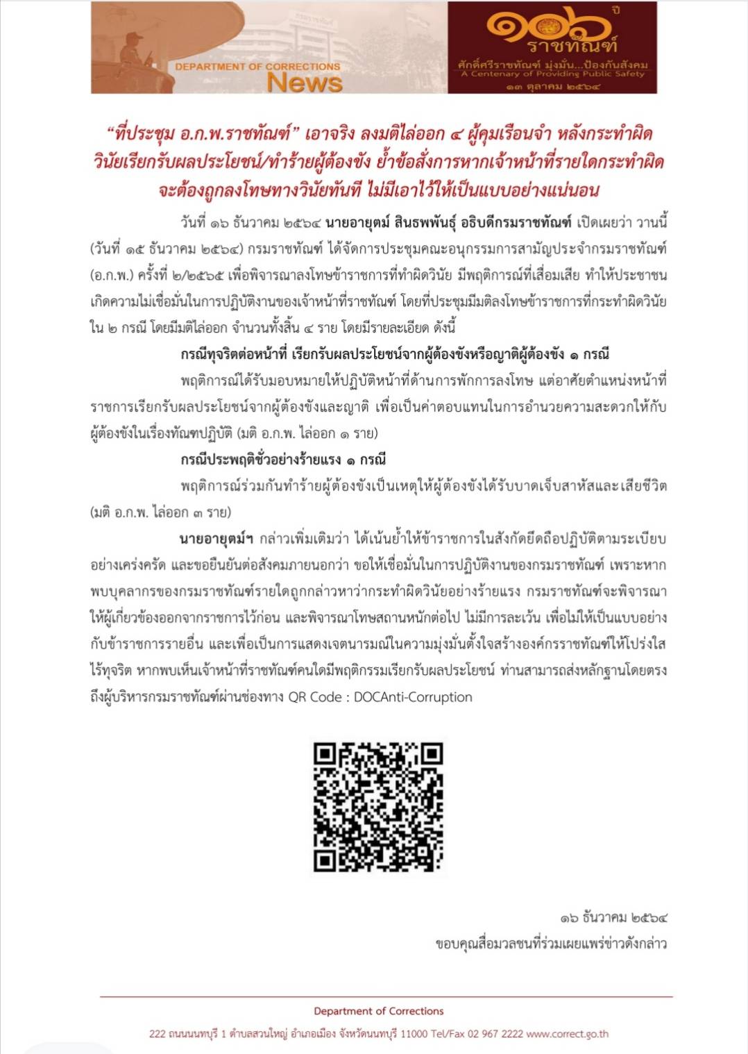 กรมราชทัณฑ์ 16 ธ.ค.-ที่ประชุม อ.ก.พ.ราชทัณฑ์ ลงมติไล่ออก 4 ผู้คุมเรือนจำ หลังกระทำผิดวินัยเรียกรับผลประโยชน์/ทำร้ายผู้ต้องขัง ย้ำข้อสั่งการหากเจ้าหน้าที่รายใดกระทำผิดจะต้องถูกลงโทษทางวินัยทันที ไม่มีเอาไว้ให้เป็นแบบอย่างแน่นอน