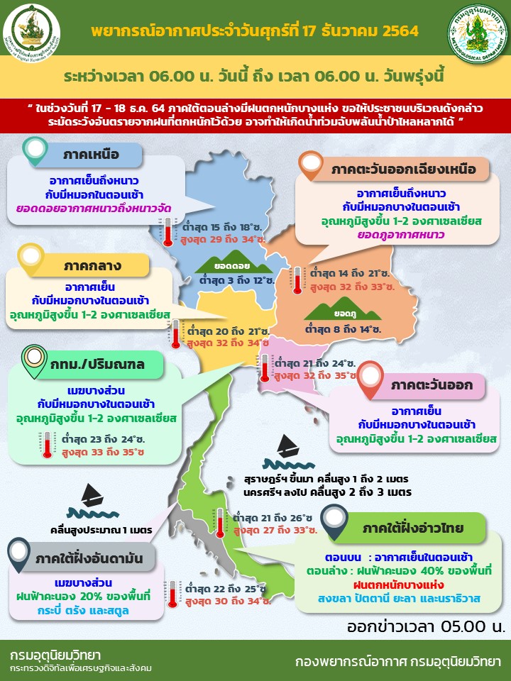 กรมอุตุนิยมวิทยา พยากรณ์อากาศ 24 ชั่วโมงข้างหน้า หย่อมความกดอากาศต่ำกำลังแรงปกคลุมบริเวณประเทศมาเลเซีย ทำให้ภาคใต้ตอนล่างมีฝนตกหนักบางแห่ง ขอให้ประชาชนบริเวณดังกล่าวระมัดระวังอันตรายจากฝนตกหนักซึ่งอาจทำให้เกิดน้ำท่วมฉับพลันและน้ำป่าไหลหลากได้ สำหรับคลื่นลมบริเวณอ่าวไทยและทะเลอันดามันมีกำลังแรง โดยอ่าวไทยตอนบนมีคลื่นสูงประมาณ 2 เมตร อ่าวไทยตอนล่างคลื่นสูง 2-3 เมตร บริเวณที่มีฝนฟ้าคะนองคลื่นสูงมากกว่า 3 เมตร ขอให้ประชาชนที่อาศัยบริเวณชายฝั่งภาคใต้ฝั่งตะวันออกระวังอันตรายจากคลื่นลมแรงที่พัดเข้าหาฝั่งไว้ด้วย ส่วนชาวเรือควรเดินเรือด้วยความระมัดระวัง และหลีกเลี่ยงการเดินเรือบริเวณที่มีฝนฟ้าคะนอง เรือเล็กบริเวณอ่าวไทยควรงดออกจากฝั่งในช่วงวันที่ 17-18 ธ.ค. 2564