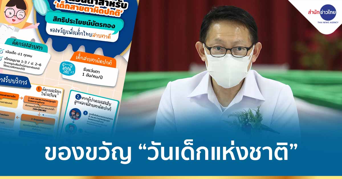 ทั้งนี้เพื่อมอบสิทธิประโยชน์นี้ให้เป็นของขวัญเด็กไทยทั่วประเทศ เนื่องในโอกาสวันเด็กแห่งชาติ ปี 2565 สปสช.ได้ร่วมกับกระทรวงสาธารณสุข โดยกรมอนามัย กรมการแพทย์ คณะกรรมการพัฒนาระบบบริการสุขภาพ (Service plan) สาขาตา ราชวิทยาลัยจักษุแพทย์แห่งประเทศไทย กระทรวงศึกษาธิการ กรมส่งเสริมการปกครองท้องถิ่น สมาคมสันนิบาตเทศบาลแห่งประเทศไทย และสมาคมองค์การบริหารส่วนตำบลแห่งประเทศไทย ดำเนินการ “โครงการเด็กไทยสายตาดี” ในช่วงสัปดาห์วันเด็กแห่งชาติ ระหว่างวันที่ 4-14 มกราคม 2565 เพื่อเป็นการรณรงค์ให้เกิดความตื่นตัว เร่งคัดกรองสายตาให้กับเด็กไทยเพื่อค้นหาเด็กที่มีสายตาผิดปกติให้ได้รับการแก้ไขโดยเร็ว .-สำนักข่าวไทย