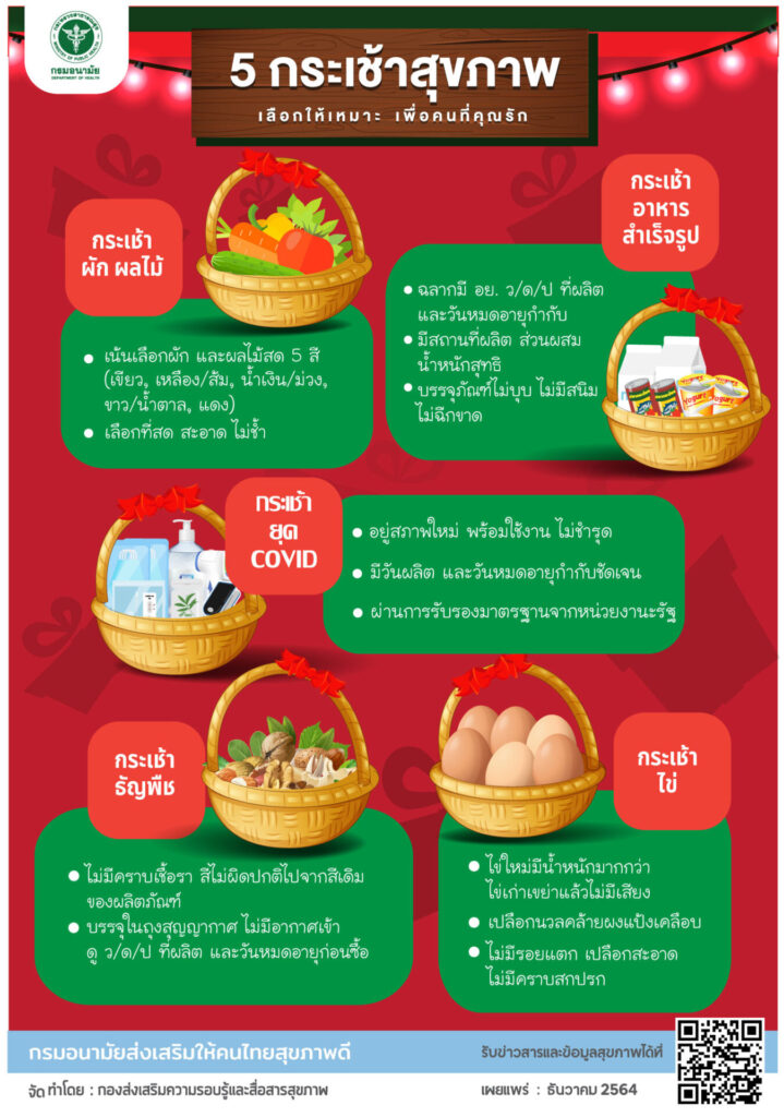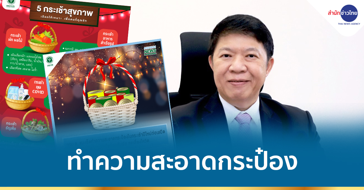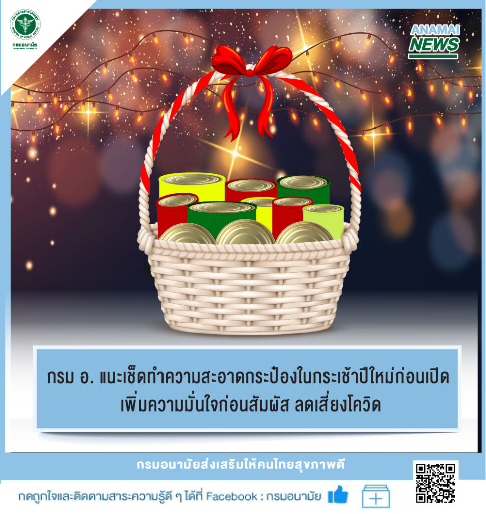 นายแพทย์สุวรรณชัย วัฒนายิ่งเจริญชัย อธิบดีกรมอนามัย เปิดเผยว่า ช่วงเทศกาลปีใหม่ประชาชน มักจะมอบกระเช้าเพื่อเป็นของขวัญให้แก่กัน ซึ่งกระเช้าประเภทเครื่องกระป๋องจะได้รับความนิยมเป็นจำนวนมากสามารถเก็บไว้ได้เป็นเวลานาน มีความหลากหลายเหมาะกับทุกเพศทุกกลุ่ม แต่ในช่วงสถานการณ์โรคโควิด-19 ที่ต้องเฝ้าระวังอย่างต่อเนื่อง เครื่องกระป๋องที่บรรจุในกระเช้าควรทำความสะอาดกระป๋องและหีบห่อ ก่อนเปิดบริโภค เพิ่มความมั่นใจ ลดเสี่ยงการสัมผัสปนเปื้อนบริเวณพื้นผิว และให้ล้างมือหลังจากสัมผัสทันที เพราะในขั้นตอนการนำกระป๋องมาบรรจุในกระเช้า ก็อาจจะมีโอกาสปนเปื้อนเชื้อไวรัสที่เกิดจากการสัมผัสของพนักงานได้ นอกจากนี้ การเลือกซื้อเครื่องกระป๋องที่มีคุณภาพนั้น ควรเลือกซื้อกระป๋องที่อยู่ในสภาพดี ไม่บุบ โดยเฉพาะตะเข็บหรือรอยต่อของกระป๋องต้องเรียบ ฝาหรือก้นกระป๋องแบนเรียบ ส่วนขอบกระป๋องจะต้องไม่มีรอยรั่วซึม ไม่เป็นสนิม ไม่โป่งนูน เนื่องจากมีแรงดันของก๊าซที่เกิดจากการเน่าเสียของอาหารภายในกระป๋อง และให้ดูฉลากสินค้าที่ผ่านการตรวจรับรองและมีเลขสารบบอาหารหรือตัวเลขหลังเครื่องหมาย อย. ที่สำคัญ คือ ควรเลือกซื้ออาหารกระป๋องที่ผลิตใหม่ โดยสังเกต วัน เดือน ปี ที่ผลิต และวันหมดอายุ และควรนำเครื่องกระป๋องประเภทเนื้อสัตว์มาอุ่นให้ร้อนก่อนบริโภค
