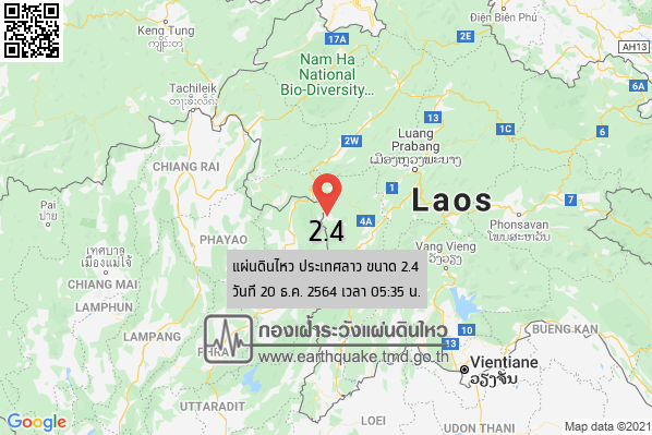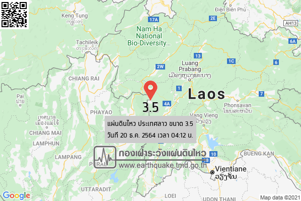 กองเฝ้าระวังแผ่นดินไหว กรมอุตุนิยมวิทยา รายงานว่า เกิดแผ่นดินไหว ขนาด 5.8 ลึก 10 กม. ที่ประเทศลาว เมื่อเวลา 04.06 น. วันนี้ (20 ธ.ค.64) ศูนย์กลางอยู่ห่างไปทางทิศตะวันออกเฉียงใต้ของบ้านน้ำช้าง ต.ขุนน่าน อ.เฉลิมพระเกียรติ จ.น่าน ประมาณ 20 กม. ยังไม่มีรายงานความเสียหาย