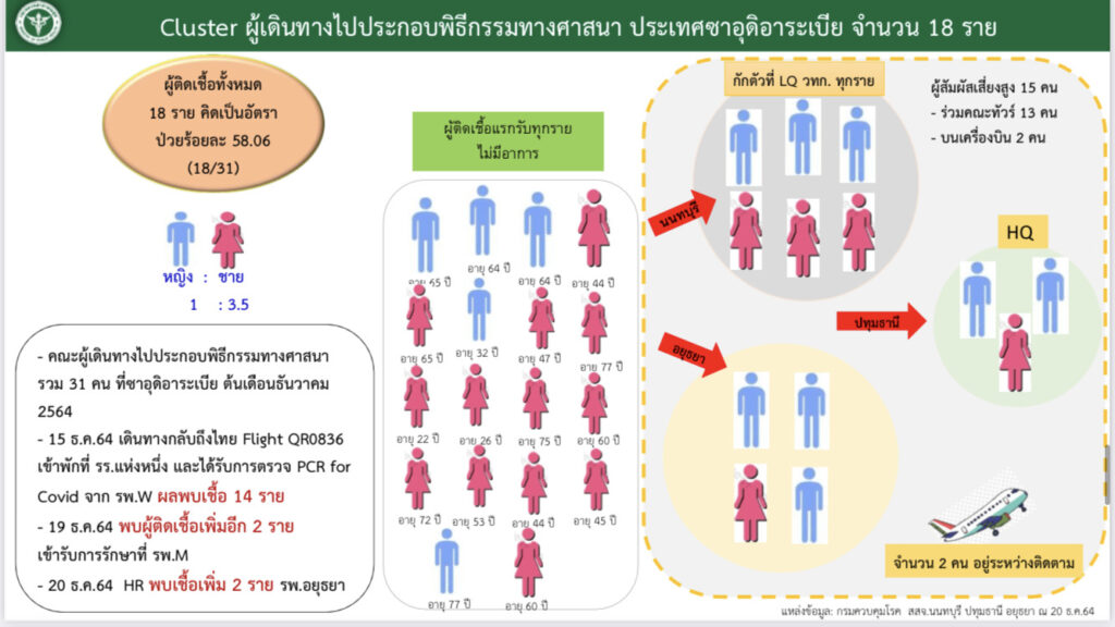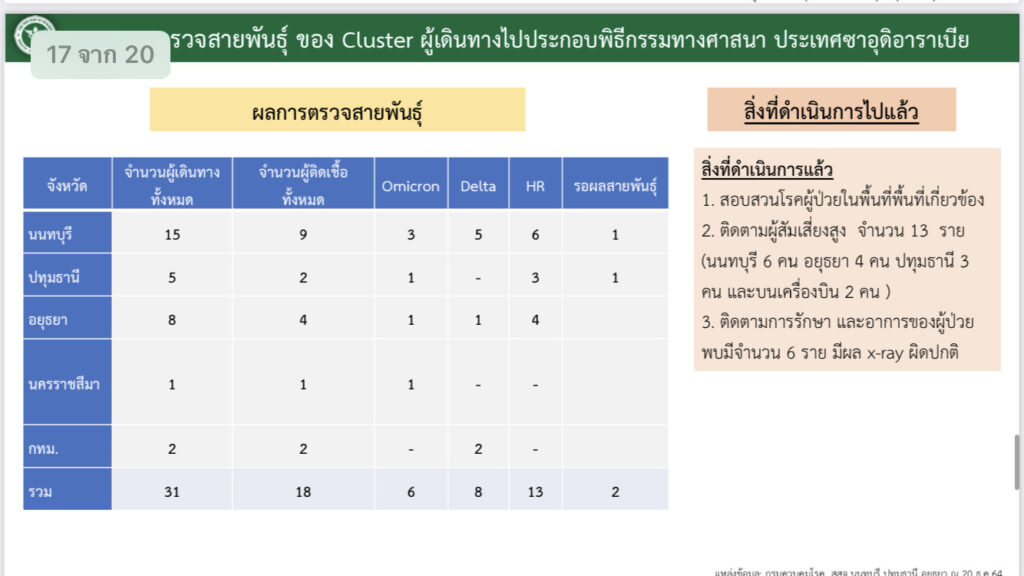 ส่วนอีกเคสเป็นกลุ่มแสวงบุญในพื้นที่ นนทบุรี พระนครศรีอยุธยา นครราชสีมา กทม. และปทุมธานี รวม 33 คน พบการติดเชื้อรวม 18 คน แบ่งเป็นติดโอไมครอน 6 คน ได้แก่ นนทบุรี 3 คน ปทุมธานี อยุธยา และนครราชสีมา จังหวัดละ 1 คน ส่วนติดเชื้อเดลตามี 8 คน ได้แก่ นนทบุรี 5 คน อยุธยา 1 คน และ กทม.2 คน ส่วนที่เหลือเป็นกลุ่มสัมผัสเสี่ยงสูง 13 คน
