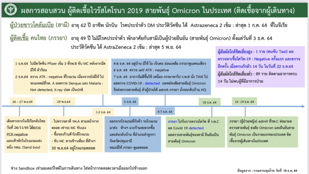 นพ.จักรรัฐ กล่าวว่า สำหรับผู้ป่วยติดเชื้อโอไมครอน รายแรกชายอเมริกัน 35 ปี รักษาหายแล้ว ส่วนรายที่พบว่าเป็นการติดเชื้อในประเทศ แต่เป็นการติดเชื้อจากผู้ที่เดินทางมาจากต่างประเทศ คือ นักบินชาวโคลอมเบีย อายุ 62 ปี มีโรคประจำตัวเบาหวาน รับวัคซีน AZ 2 เข็ม เดินทางมาจากไนจีเรีย และเข้าระบบ Sandbox เข้าไทยมาตั้งแต่ 26 พ.ย. กักตัวครบ และกลับมาอยู่บ้านกับภรรยา หลังตรวจไม่พบเชื้อเมื่อวันที่ 3 ธ.ค. ที่ จ.ปทุมธานี ส่วนภรรยาชาวไทย วัย 49 ปี รับวัคซีน AZ 2 เข็ม สามีที่เป็นนักบินเริ่มมีอาการป่วย 4 ธ.ค. ไข้ ไอ เจ็บคอ และอ่อนเพลีย ระหว่างที่ไม่สบายมีภรรยาดูแล จนเมื่อตรวจพบว่ามีอาการป่วย ก็เข้ารับการรักษาตัวใน รพ. เมื่อวันที่ 7 ธ.ค. ส่วนภรรยาเมื่อพบสามีก็ Home Isolation และเมื่อผลตรวจยืนยันพบว่าติดเชื้อก็เข้ารับการรักษาใน รพ. ในเคสมีผู้สัมผัสเสี่ยงสูง 1 คน เป็นคนขับแท็กซี่ที่รับส่ง และตามตัวพบแล้ว ตรวจผลเป็นลบ และจะตรวจซ้ำอีกครั้งในวันที่ 22 ธ.ค.นี้