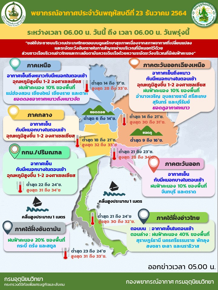 กรมอุตุนิยมวิทยา พยากรณ์อากาศ 24 ชั่วโมงข้างหน้า บริเวณความกดอากาศสูงหรือมวลอากาศเย็นกำลังปานกลางที่ปกคลุมประเทศไทยตอนบนเริ่มมีกำลังอ่อนลง ประกอบกับมีลมตะวันออกพัดปกคลุม ทำให้บริเวณดังกล่าวมีอุณหภูมิสูงขึ้น กับมีหมอกในตอนเช้า แต่ยังคงมีอากาศเย็นถึงหนาวในภาคเหนือและภาคตะวันออกเฉียงเหนือ ส่วนภาคกลางและภาคตะวันออก มีอากาศเย็นในตอนเช้า สำหรับยอดดอยมีอากาศหนาวถึงหนาวจัด อุณหภูมิต่ำสุด 6-14 องศาเซลเซียส และยอดภูมีอากาศหนาว อุณหภูมิต่ำสุด 9-16 องศาเซลเซียส ในขณะที่คลื่นกระแสลมฝ่ายตะวันตกในระดับบนเคลื่อนผ่านภาคเหนือตอนบน ทำให้บริเวณดังกล่าวมีฝนเกิดขึ้นได้บางพื้นที่ ขอให้ประชาชนบริเวณประเทศไทยตอนบนดูแลรักษาสุขภาพ เนื่องจากสภาพอากาศที่เปลี่ยนแปลง และระมัดระวังอันตรายจากการสัญจรผ่านบริเวณที่มีหมอก ส่วนเกษตรกรในภาคเหนือตอนบนควรระวังความเสียหายต่อผลผลิตทางการเกษตรที่จะเกิดขึ้นในระยะนี้ไว้ด้วย